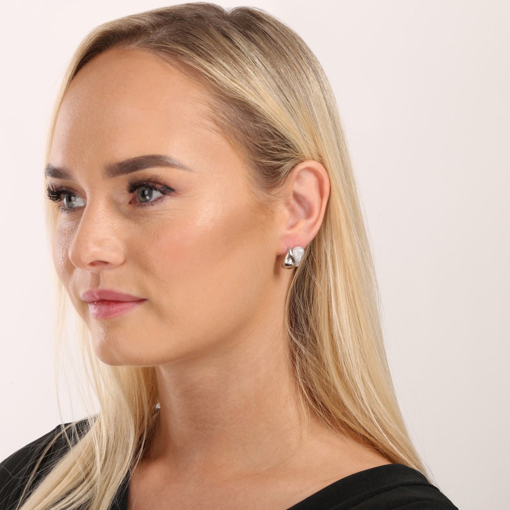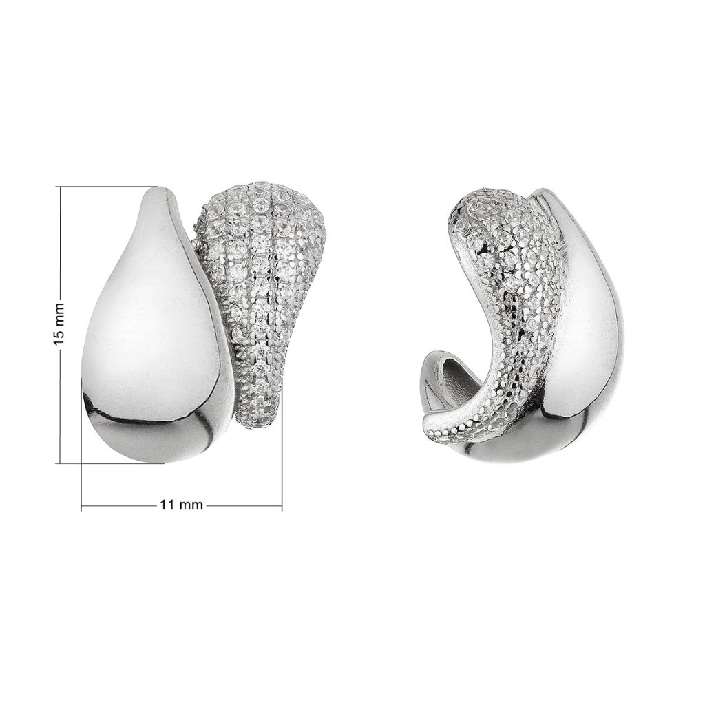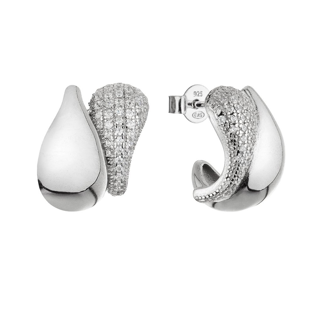 Výrazné, ale napriek tomu elegantné - presne také sú tieto kruhové strieborné náušnice, ktoré zaujmú svojim netradičným poňatím klasického kruhu . Dizajn šperku tvoria dve kvapky spojené do neúplného kruhu – jedna s hladkým lesklým povrchom, druhá žiara vďaka jemne zasadeným zirkónom. Spoločne vytvárajú harmonický kontrast, ktorý priťahuje pohľady a dodáva šperku moderný šmrnc.