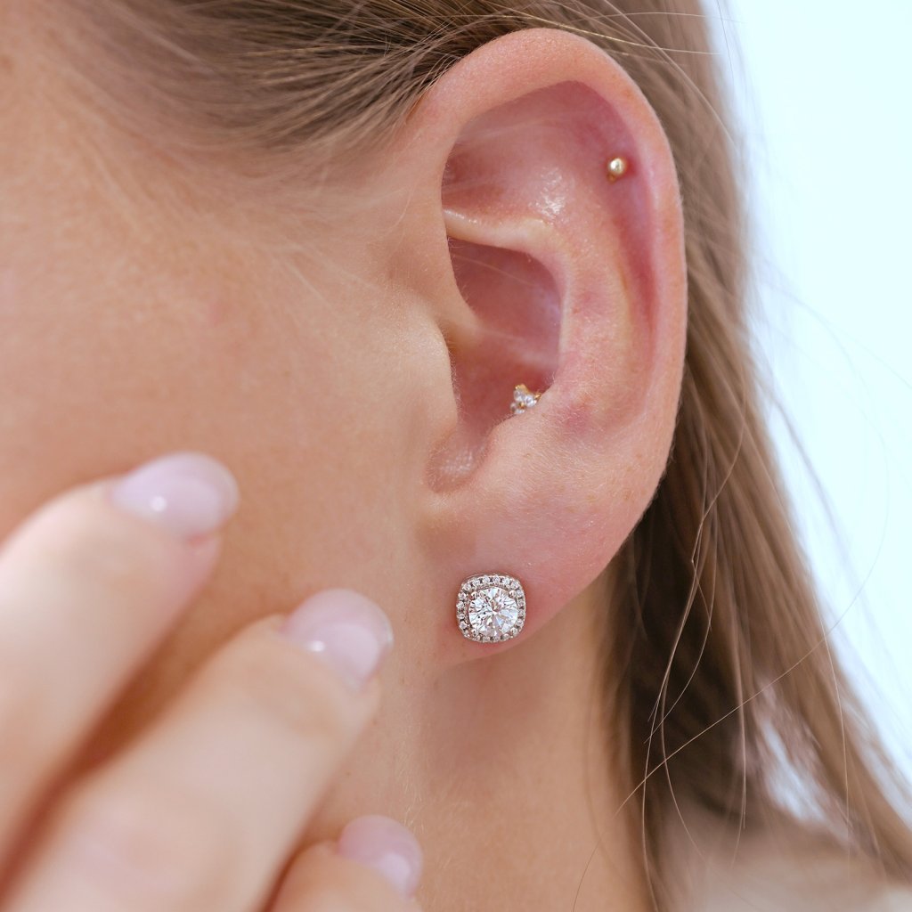 Srdcom každej náušnice je veľký, dokonale brúsený okrúhly moissanit , ktorý zachytáva a odráža svetlo s neuveriteľnou intenzitou. Jeho brilanciu ešte umocňuje lem menších, starostlivo vsadených moissanitových kamienkov, ktoré lemujú celý štvorcový obvod a vytvárajú tak nádherný efekt.