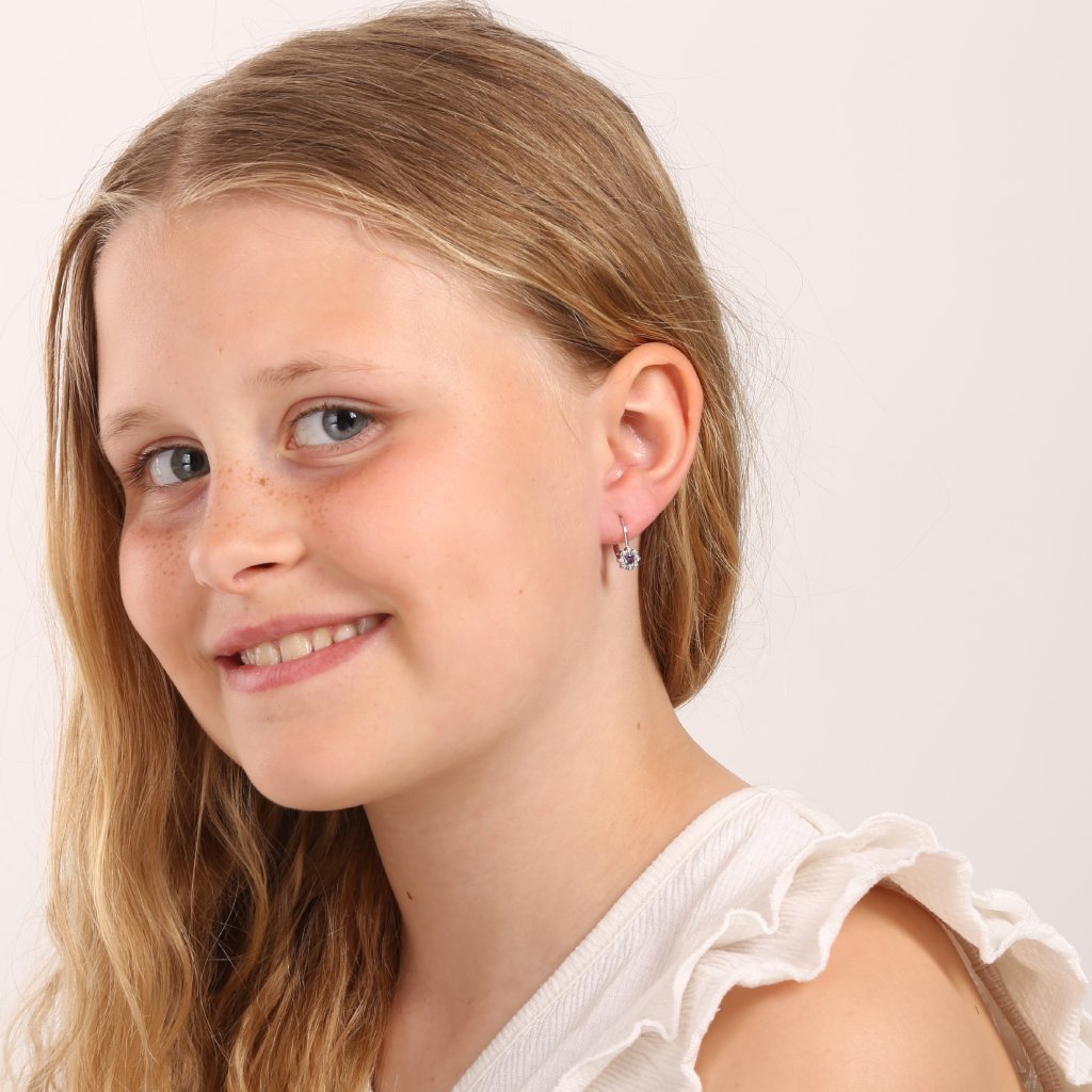 Strieborné náušnice v tvare kvetinky bude Vaše malé dievčatko nosiť s radosťou!Visiace náušnice 11476.3 sú vyrobené zo striebra rýdzosti 925/1000 , ktorého povrch je upravený ródiom. Rhodium šperk ochráni proti sčernaniu, zožltnutiu alebo poškriabaniu. Uprostred kvietku je trblietavý fialový zirkón a okvetné lístočky tvoria malé biele zirkóny. Náušnice sa zapínajú na klapku. Šperk neobsahuje nikel , a tak sa nemusíte obávať žiadne alergické reakcie.