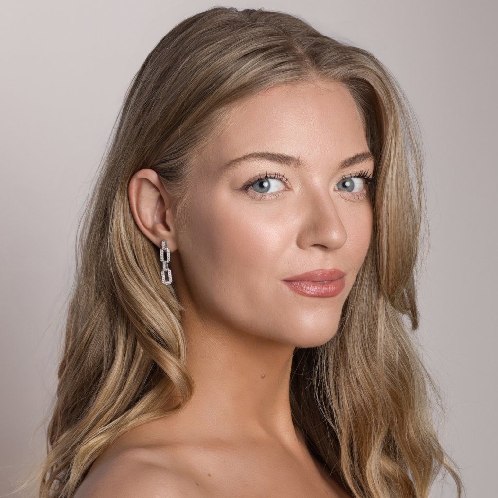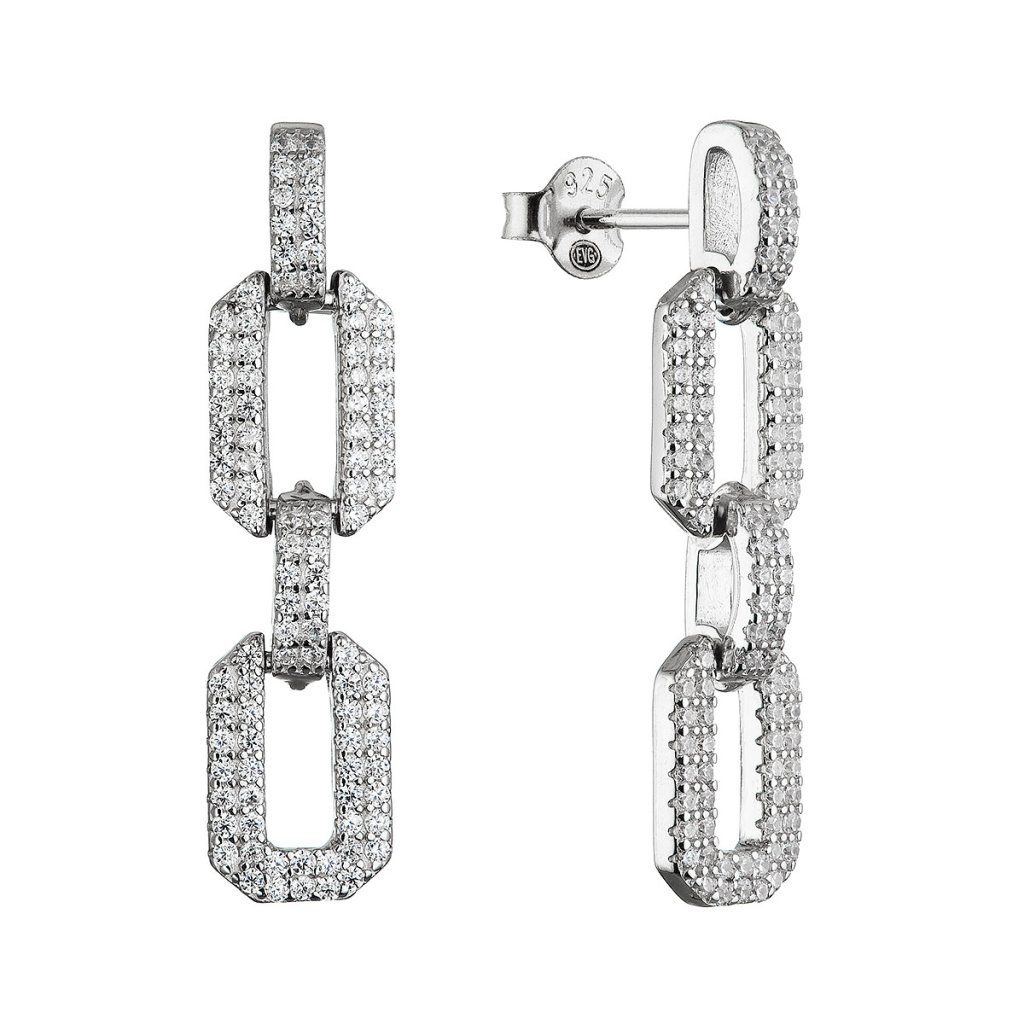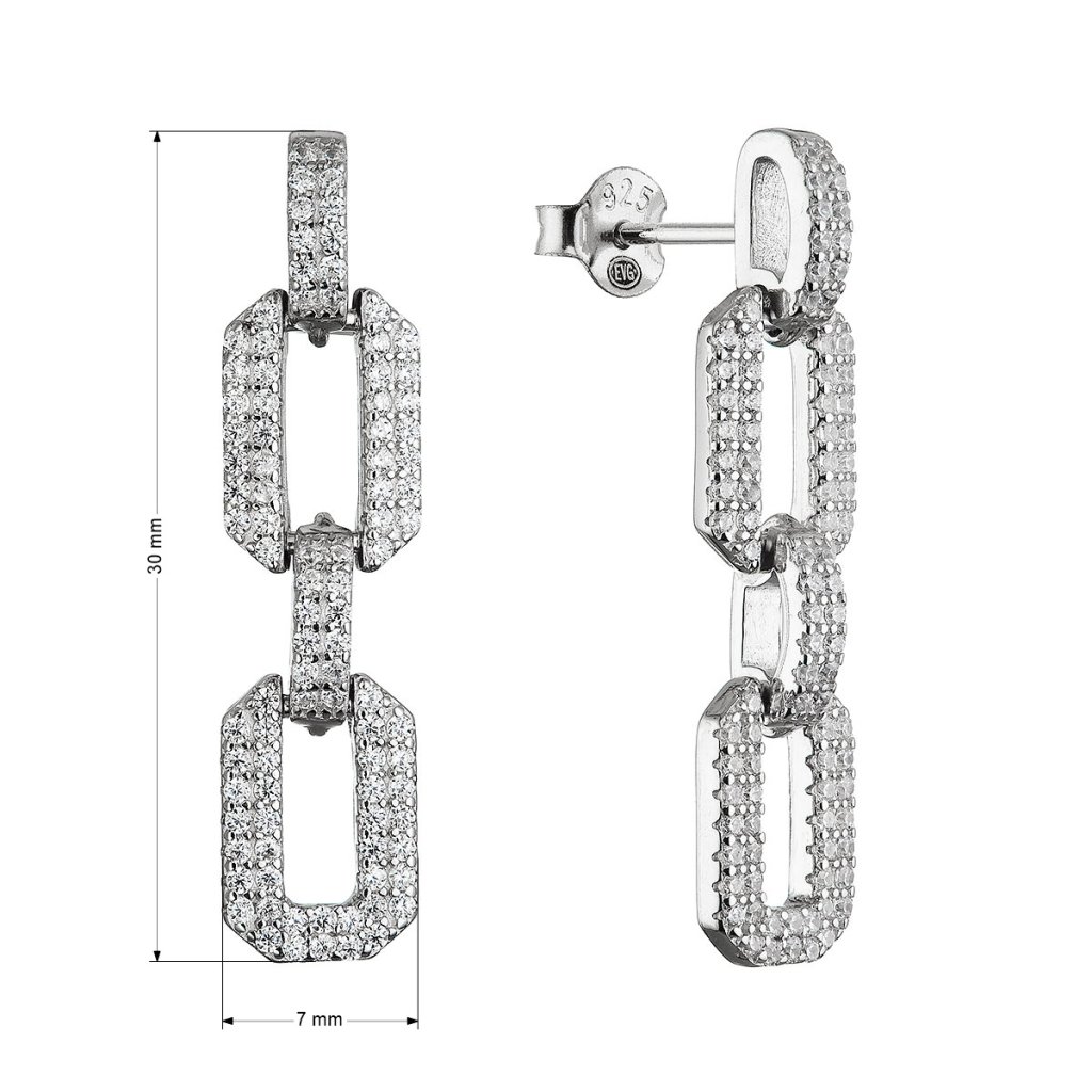 Strieborné visiace náušnice 925/1000 s ródiovou úpravou prinášajú odvážny a moderný vzhľad inšpirovaný štruktúrou reťaze. Ich robustný dizajn tvoria prepojené oválne očká, z ktorých každé je precízne vysadené trblietavými čírymi kamienkami, ktoré dodávajú šperku výrazný lesk a eleganciu.