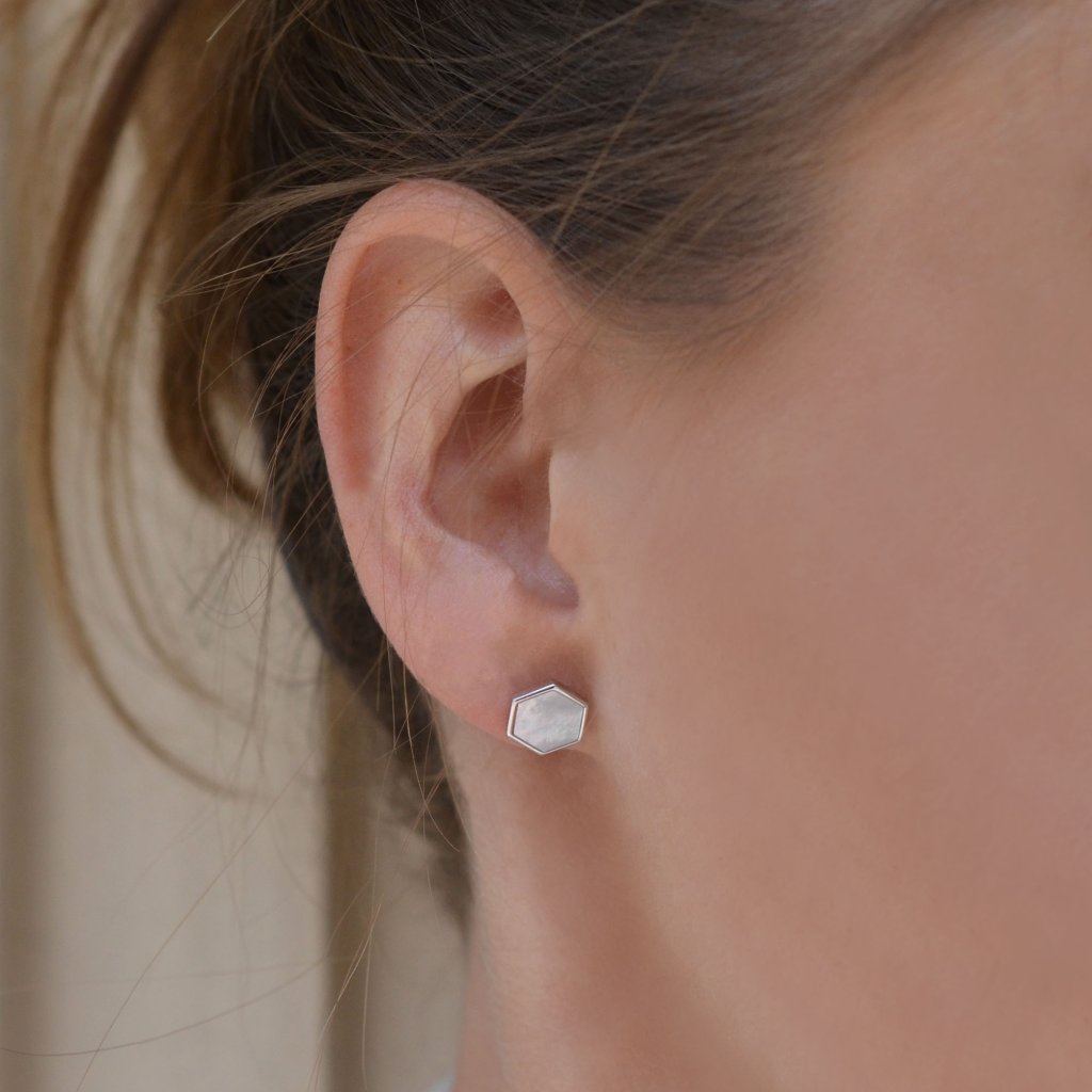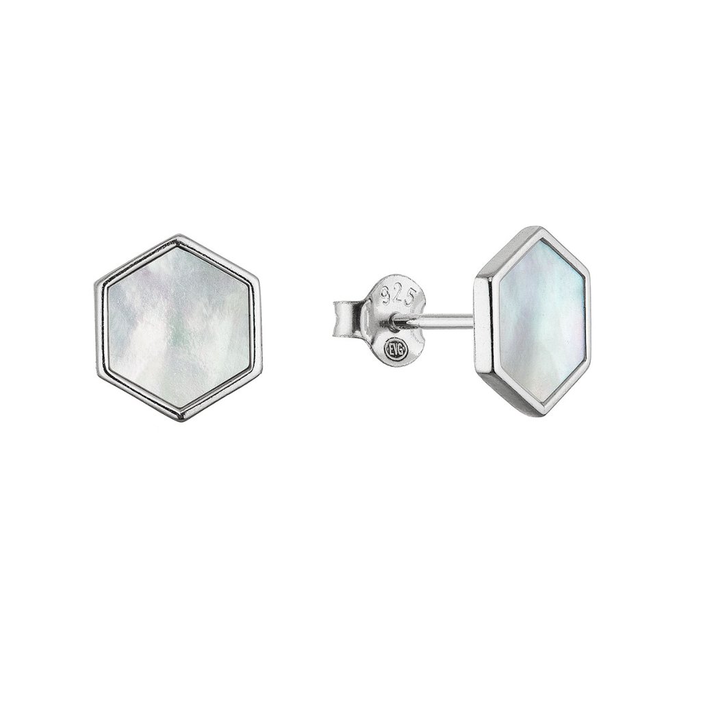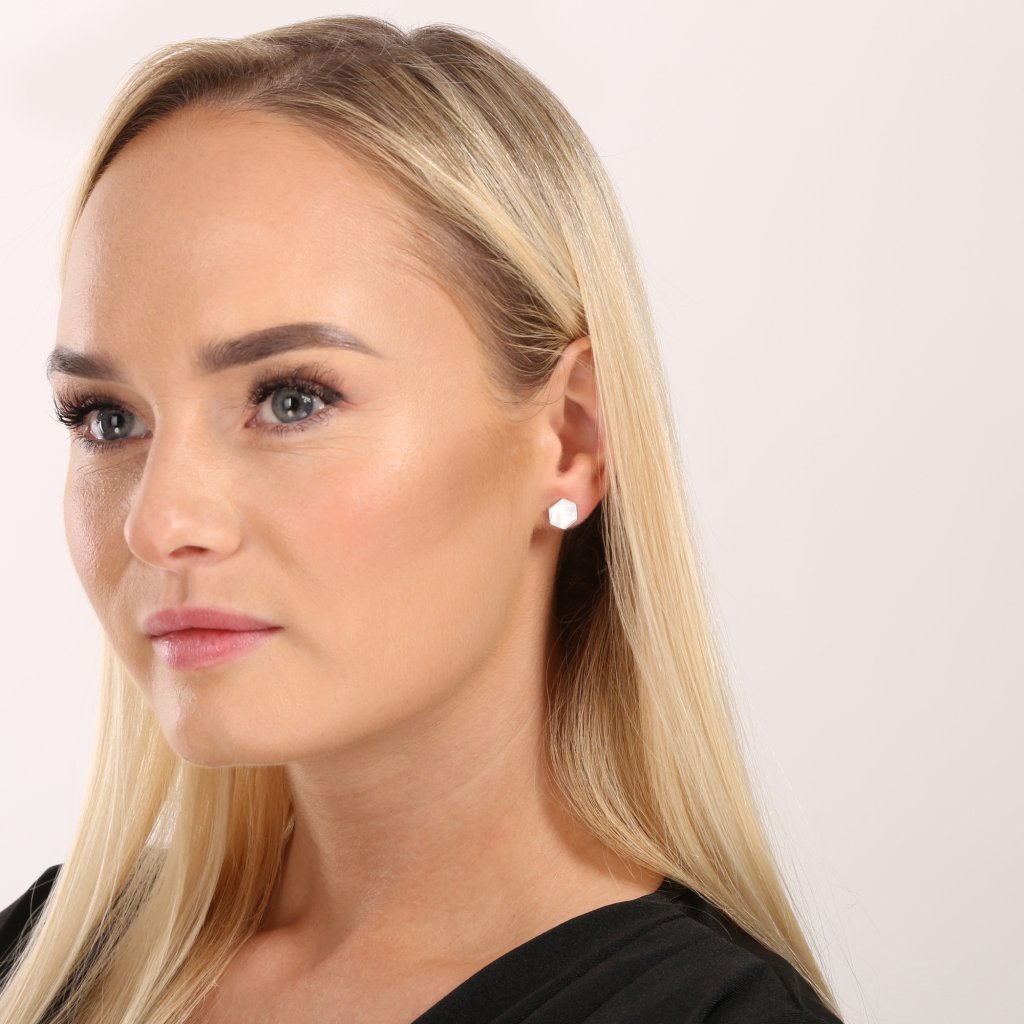 Hexagónové náušnice očarí moderným tvarom a jemnou perleťou. Strieborný šesťuholník s hladkým povrchom je vyplnený bielou perleťou, ktorá dodáva šperku jemný lesk a sofistikovanosť.