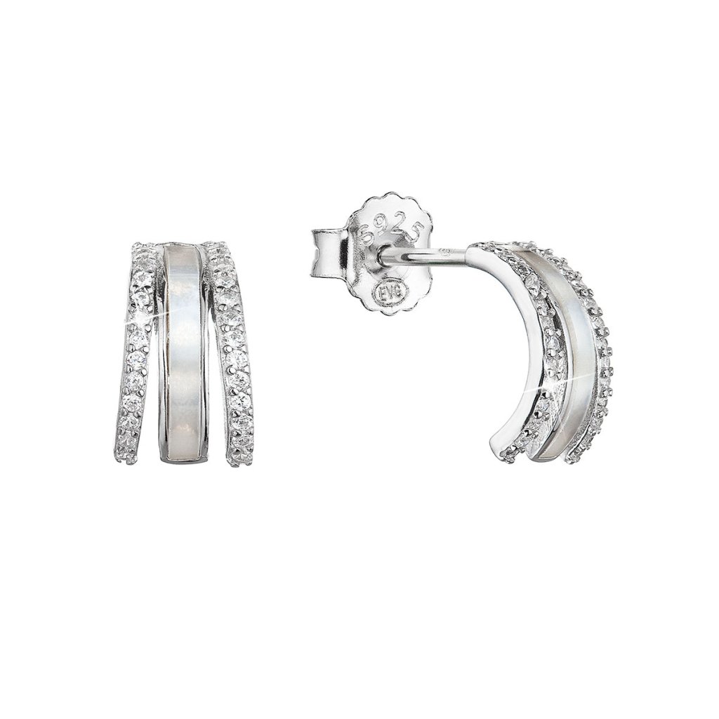 Strieborné náušnice kôstky polkruhy biele zirkóny a perleť 11422.1