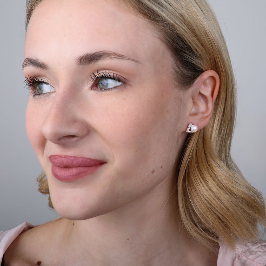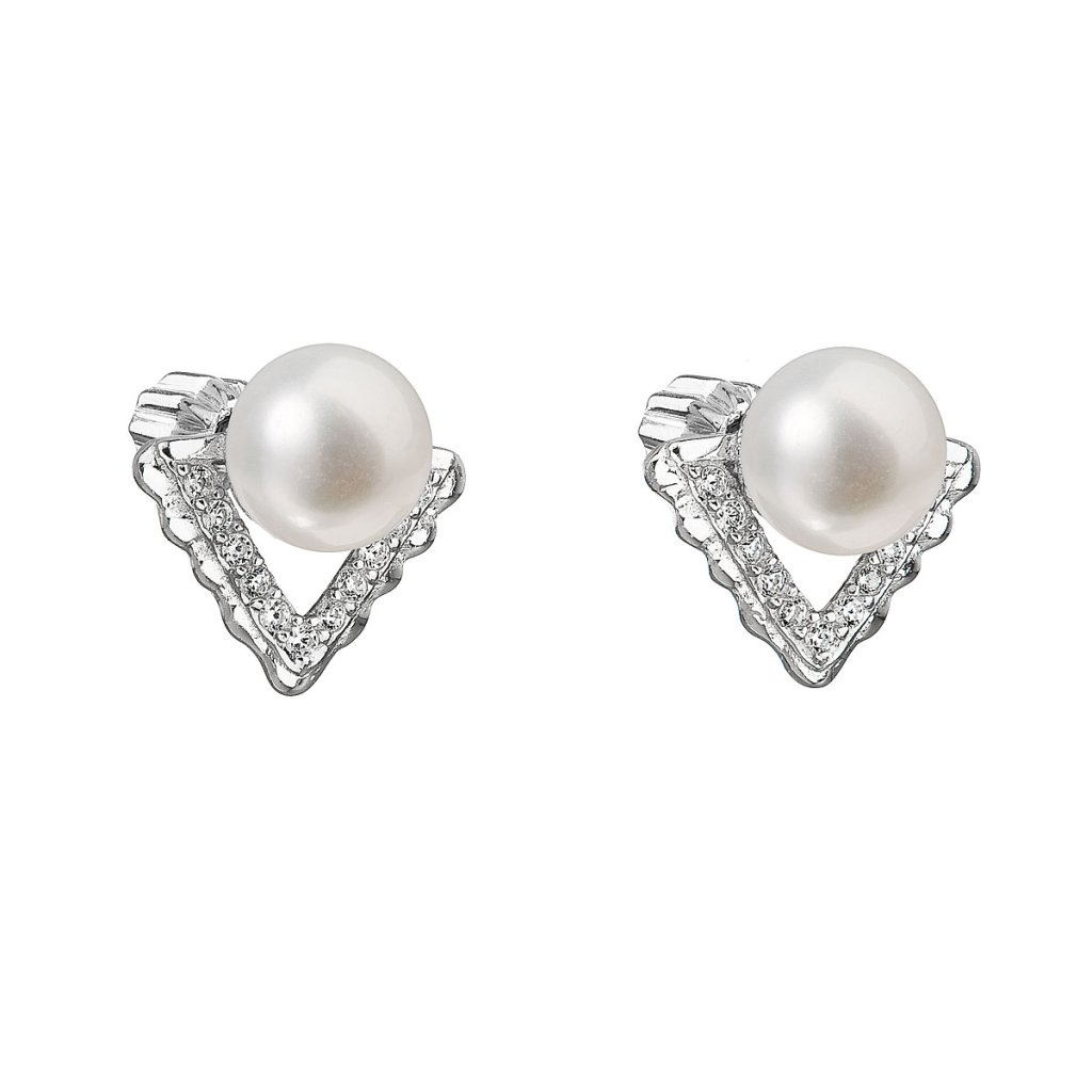 Moderné strieborné náušnice 21012.1 ponúkajú originálny a neopozeraný dizajn v tvare trojuholníčkov vysadených 11 trblietavými zirkónmi s veľkou bielou riečnou perlou uprostred. Náušnice sú vyrobené zo striebra rýdzosti 925/1000 a majú zapínanie na balónik. Ten spoľahlivo ochráni šperk proti nechcenej strate. Perly, ktorými sú náušnice zdobené, spadajú do kategórie najvyššej kvality AAA . Náušnice sa nemusia báť nosiť ani alergici, sú kvalitné a neobsahujú žiadny prídavok lacného niklu.