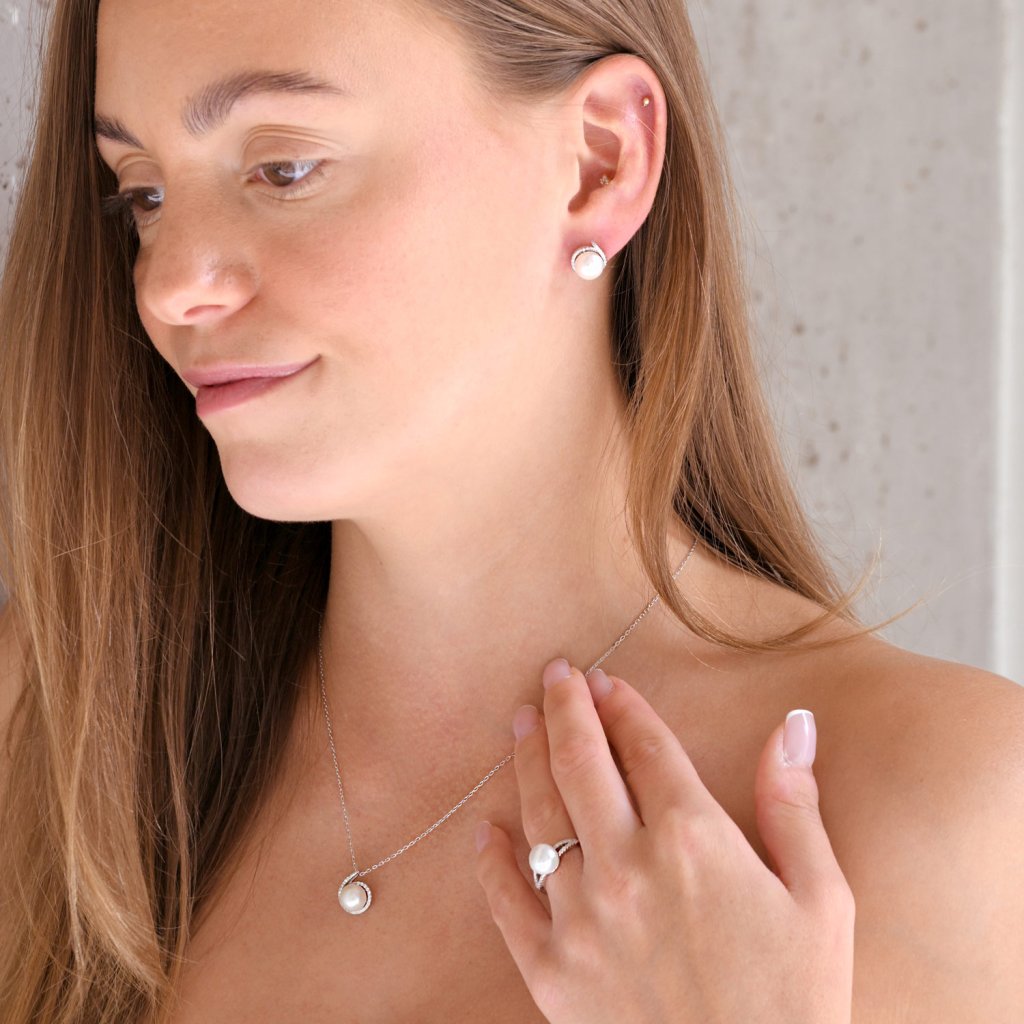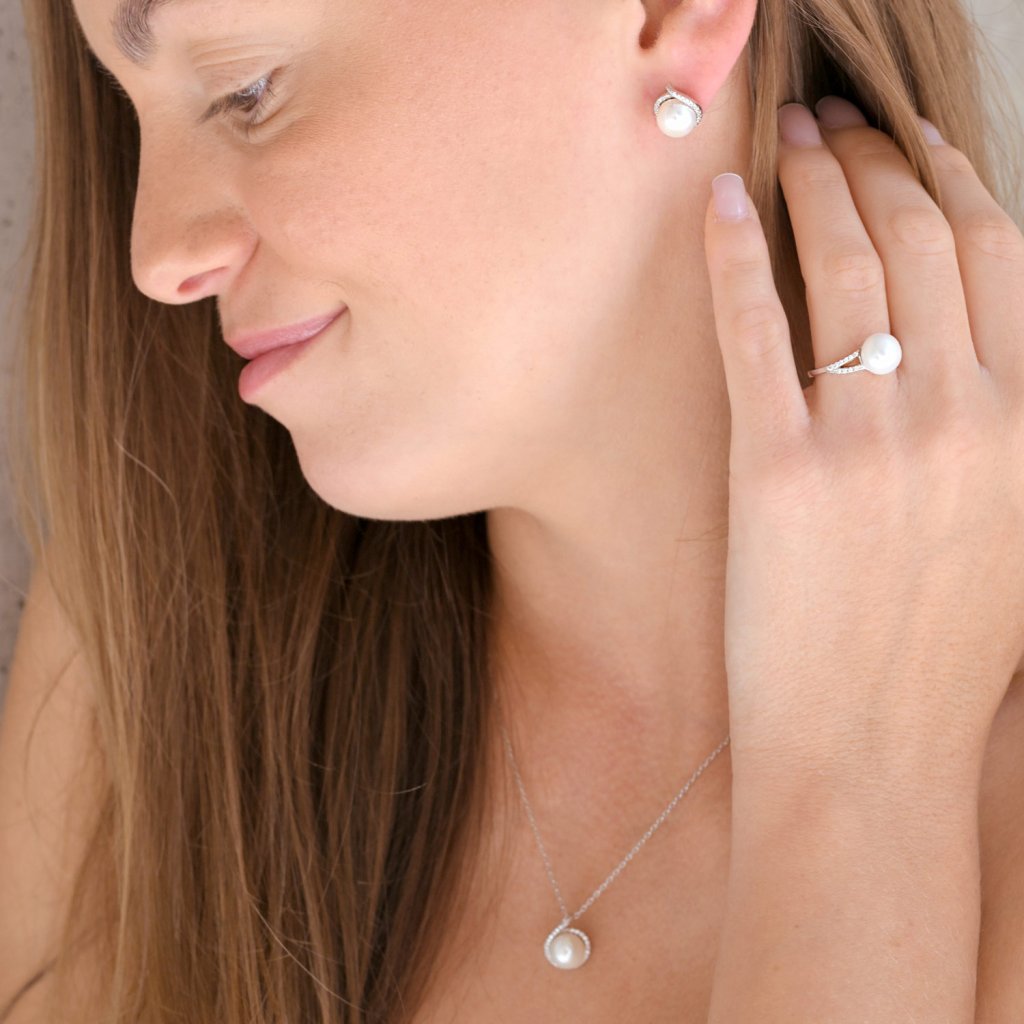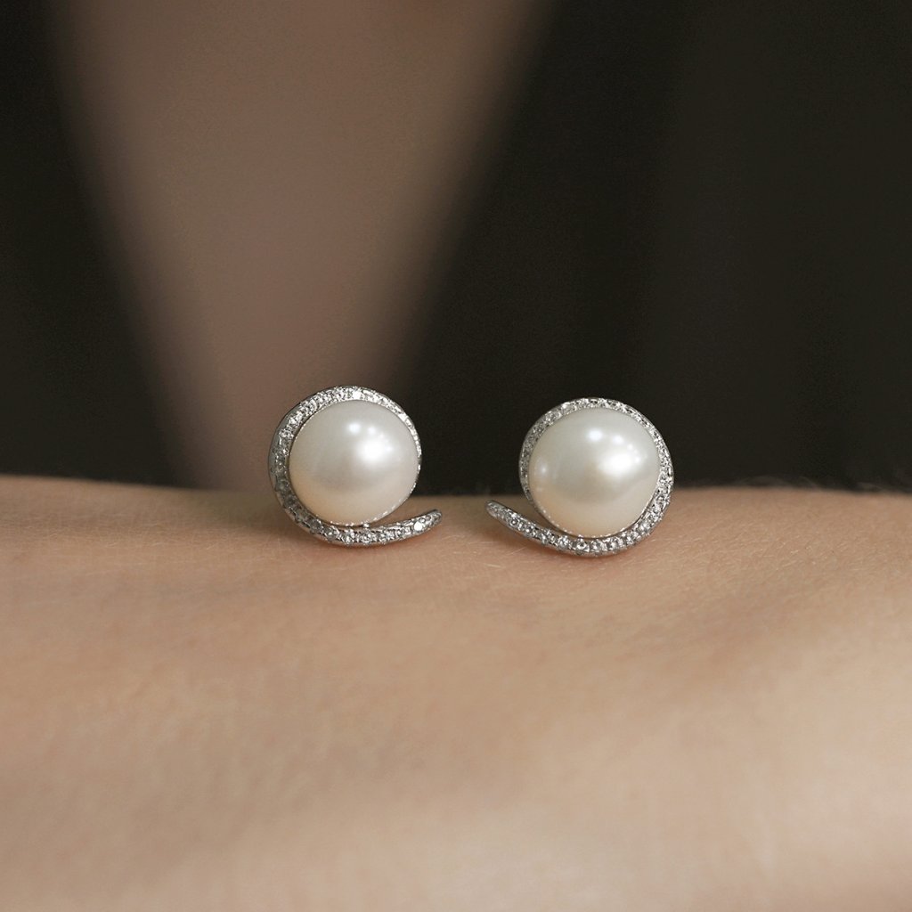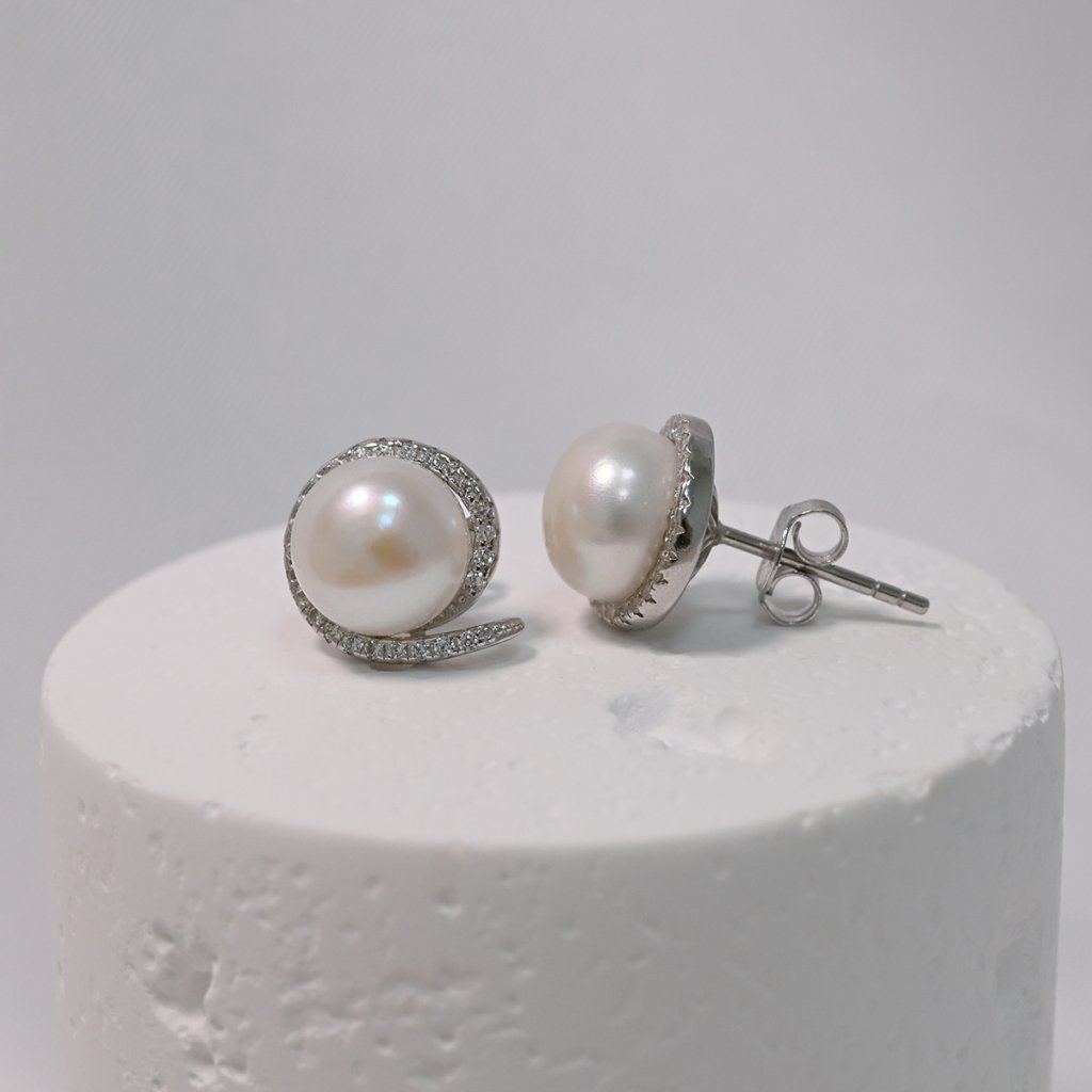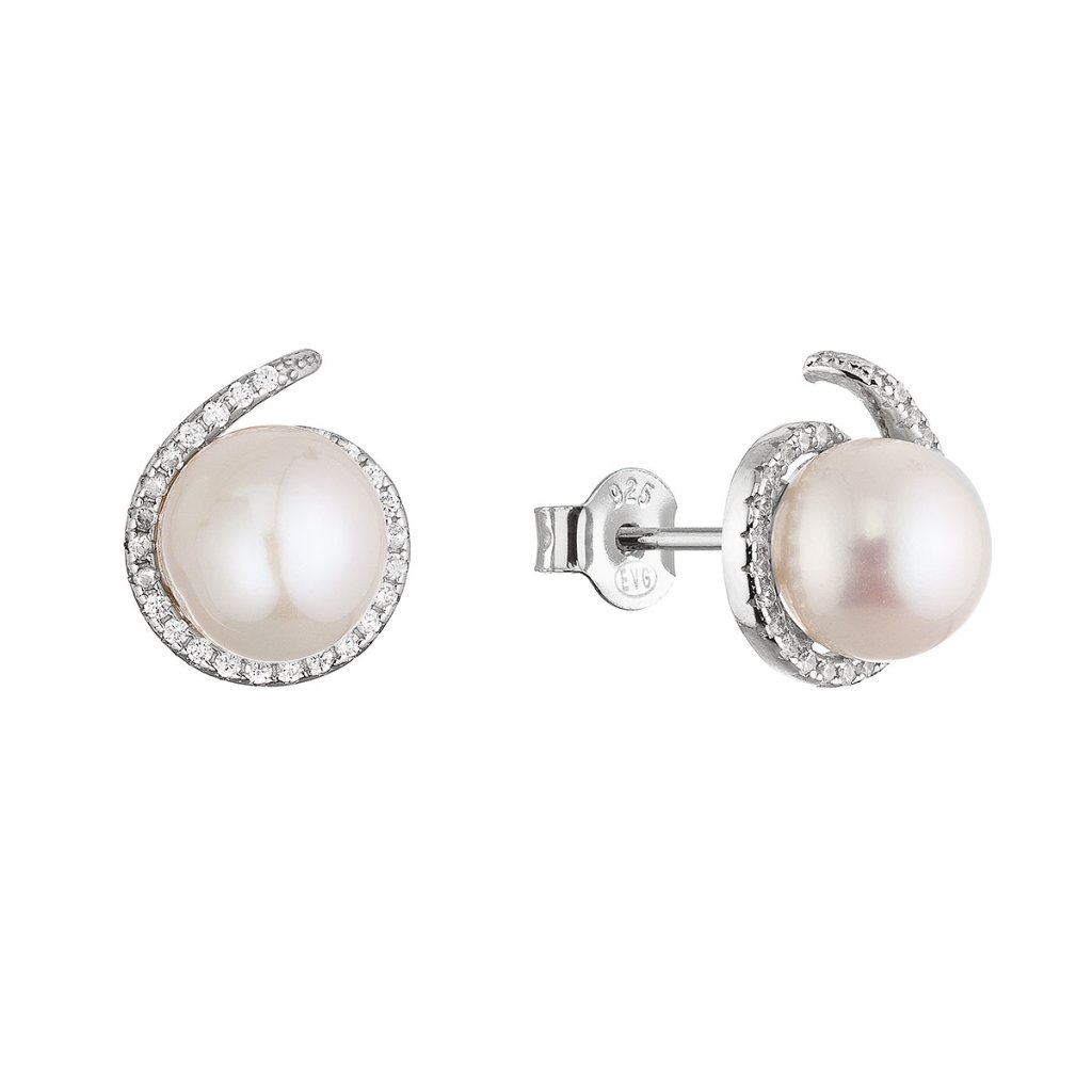 Strieborné náušnice kôstky s bielou riečnou perlou a zirkónmi 21116.1