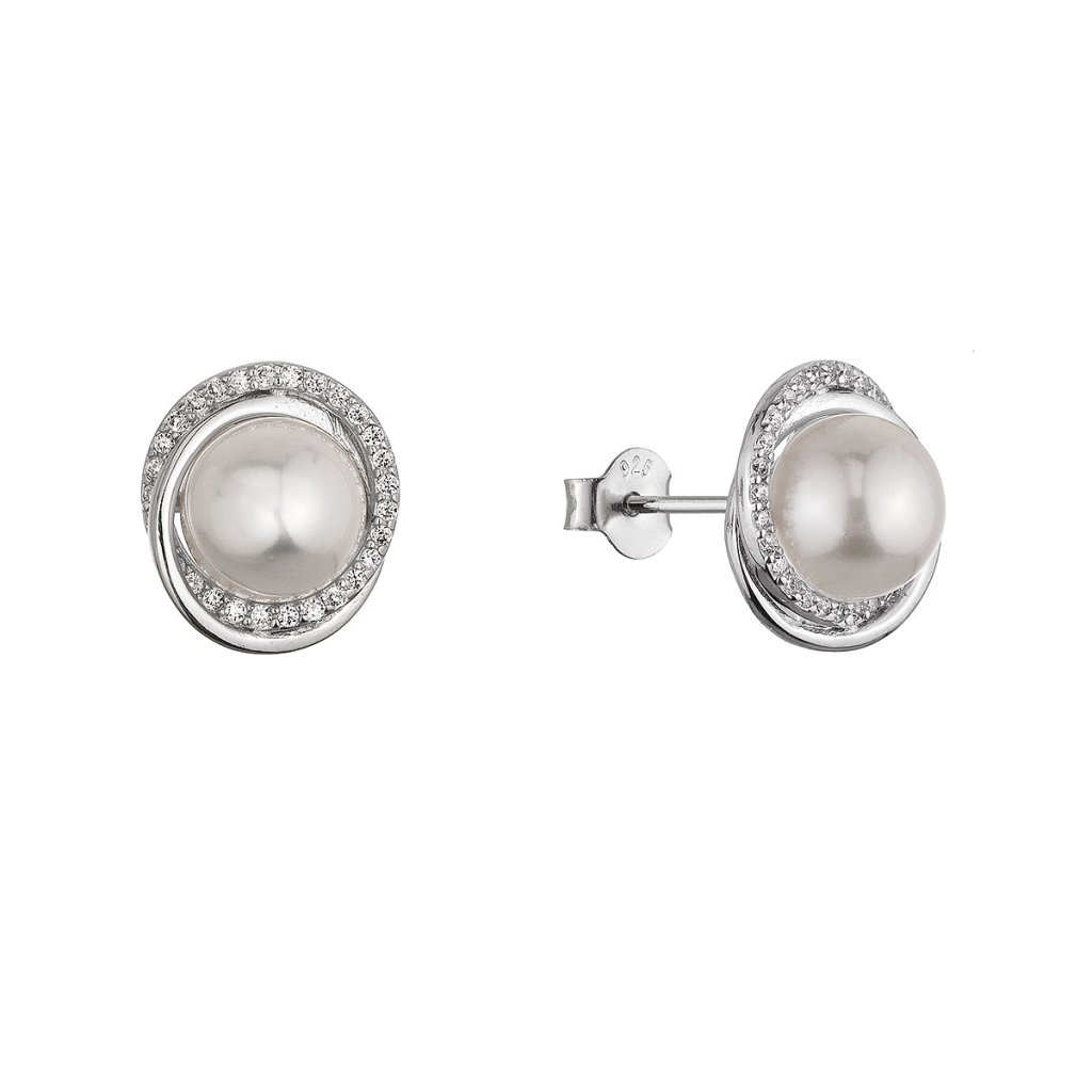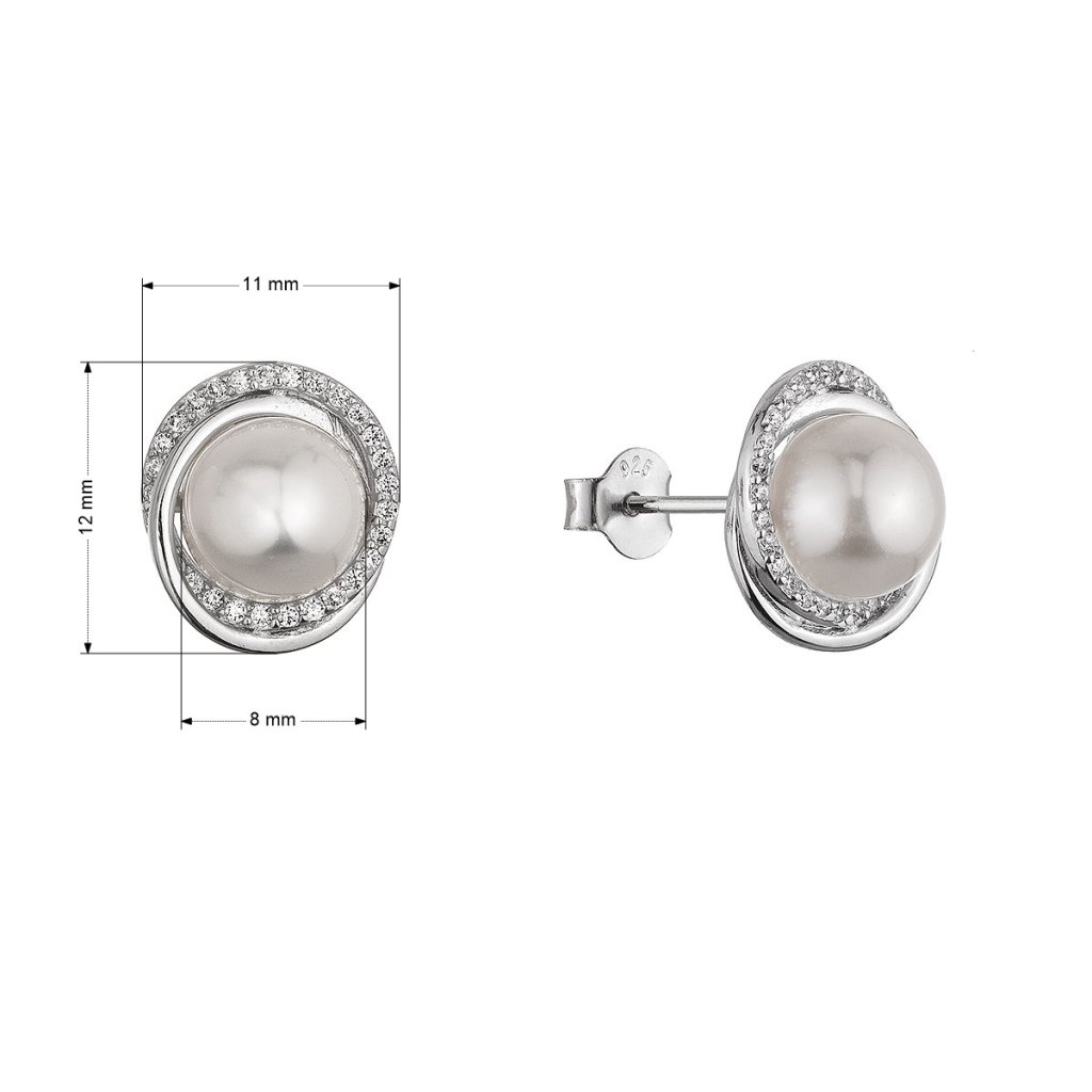 Strieborné náušnice kôstky s bielou riečnou perlou a zirkónmi okrúhle 21113.1