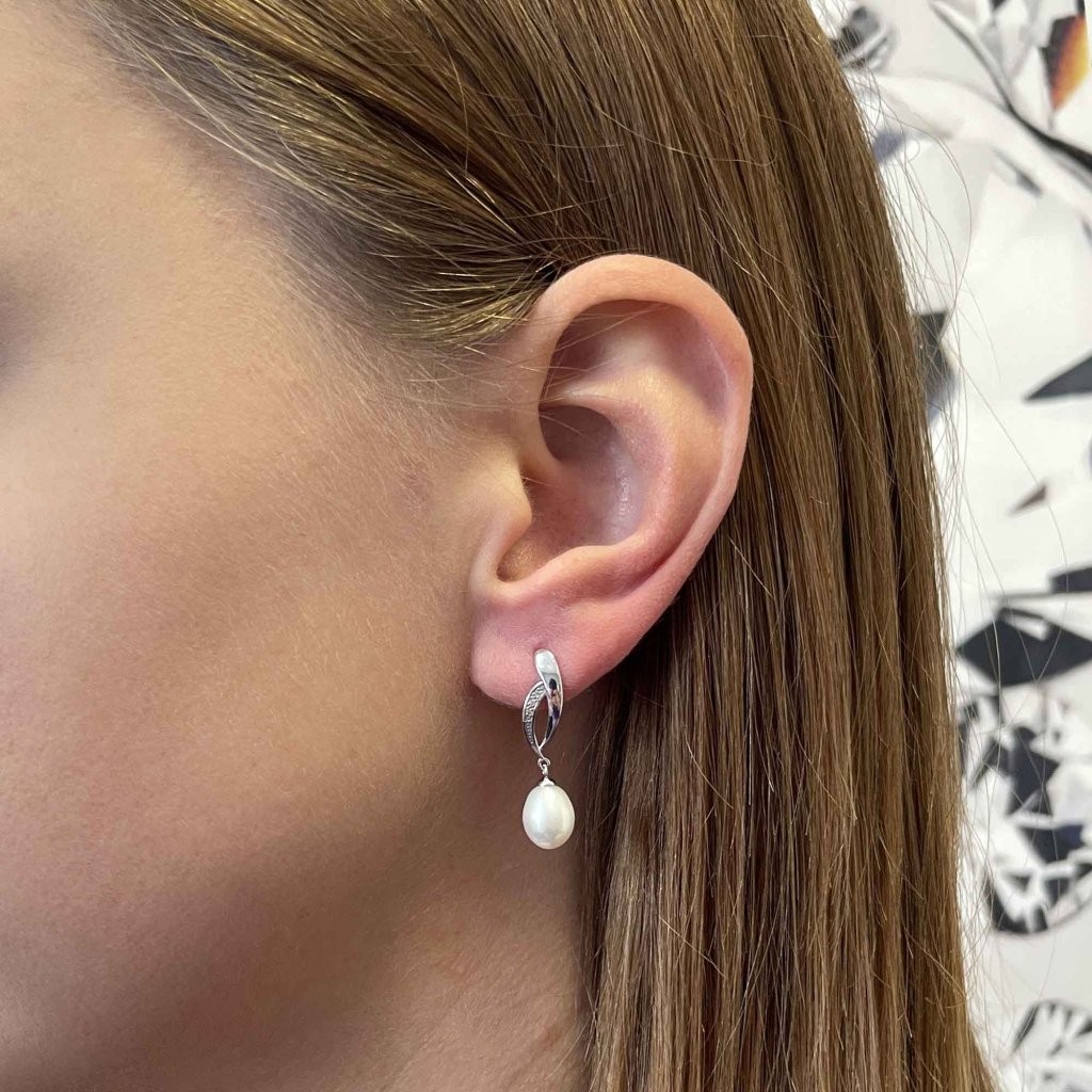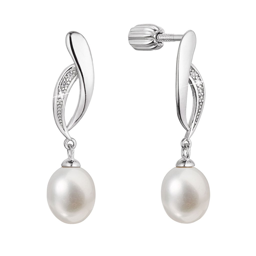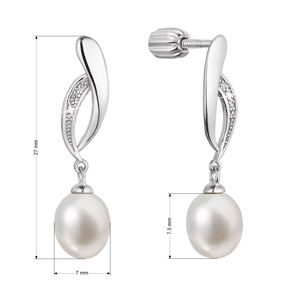 Strieborné visiace náušnice s bielou riečnou perlou a trblietavými zirkónmi sú očarujúcou kombináciou.Náušnice 21103.1B sú vyrobené zo striebra o rýdzosti 925/1000 a zaujmú voľne sa hojdajúcu riečnu perlou. Perly sú oválneho tvaru 7,5 x 7 mm a kvality A . Náušnice sú navyše zdobené priezračnými zirkónmi, ktoré ich krásne rozžiaria.