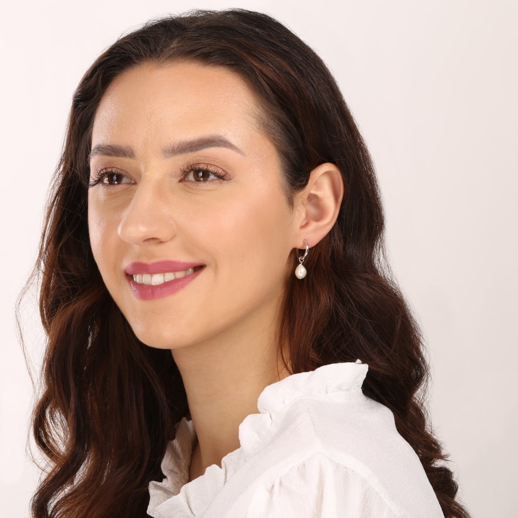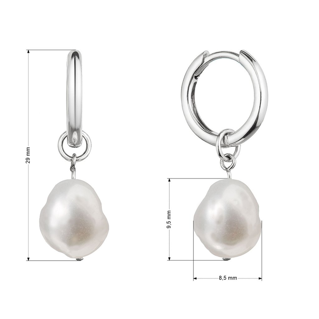 Strieborné náušnice kruhy s visiacou bielou riečnou perlou baroko 21106.1
