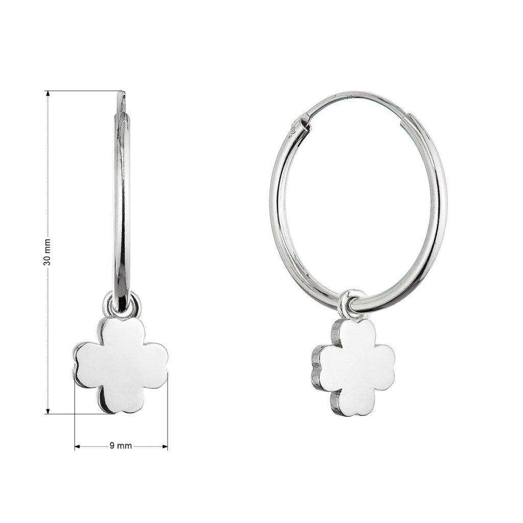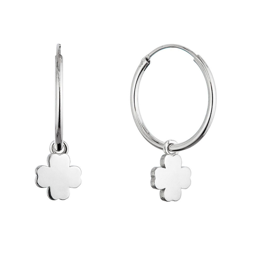 Tieto kruhové strieborné náušnice s príveskom v tvare štvorlístka sú elegantným a zároveň hravým doplnkom. Štvorlístok je symbol šťastia a šťastie prinesie aj tým, ktorí ich nosia.Náušnice sú vyrobené zo striebra o rýdzosti 925/1000 a sú opatrené vrstvou ródia , ktorá šperk ochráni pred sčernením, zožltnutím alebo poškriabaním. Krúžkové zapínanie zaisťuje pohodlné nosenie po celý deň.