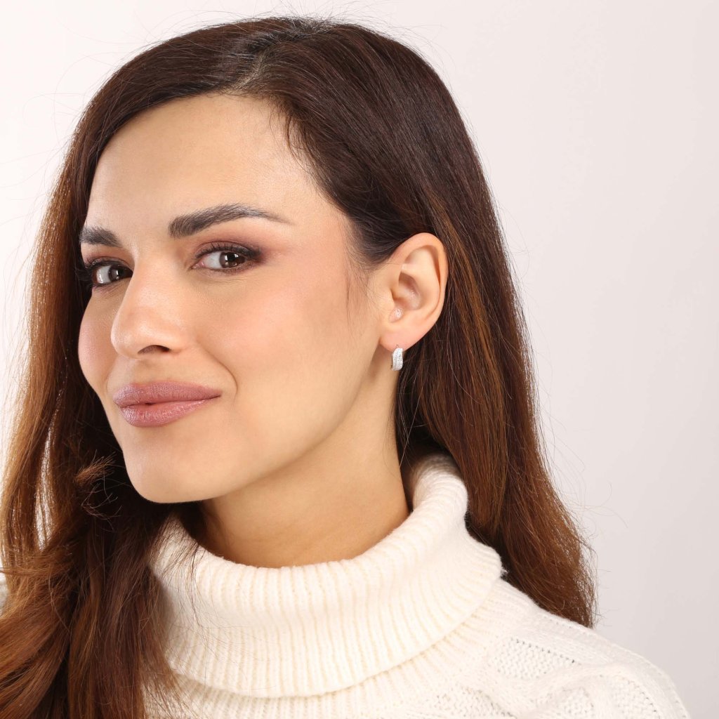 Kruhy vyrábame zo striebra rýdzosti 925/1000, ktorého povrch je upravený ródiom. Ródium šperk ochraňuje proti sčernaniu, zožltnutiu alebo poškriabaniu. Kruhy ozdobené malinkými zirkónmi v bielej farbe.