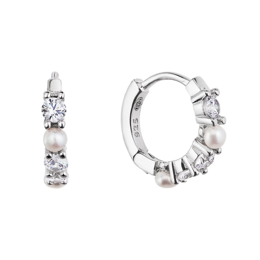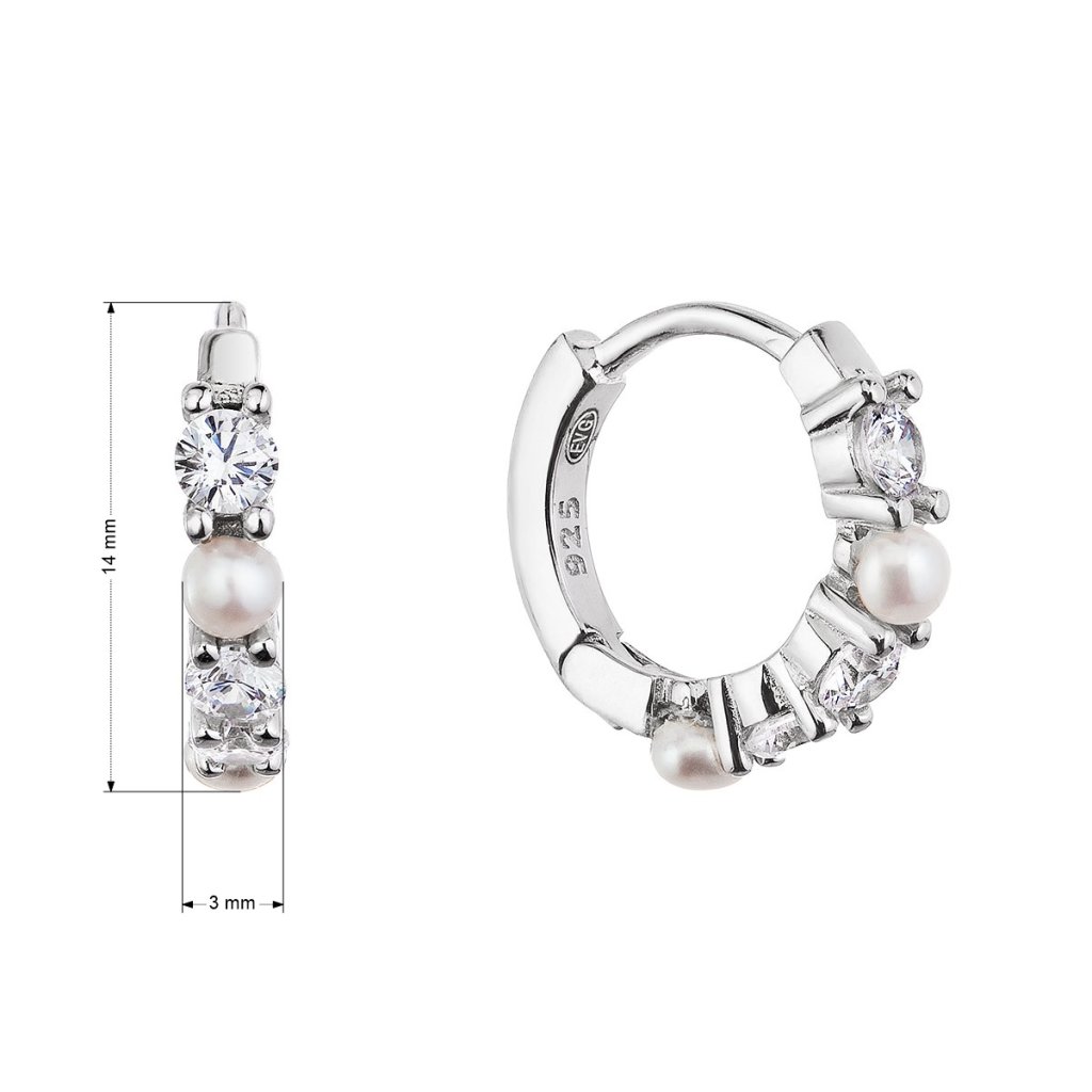 Strieborné náušnice krúžky s bielymi riečnymi perlami a zirkónmi 21077.1