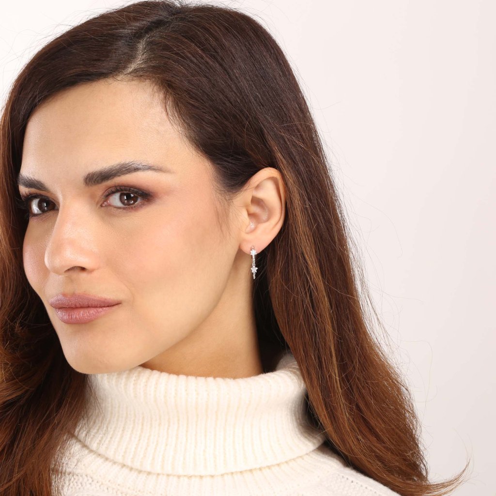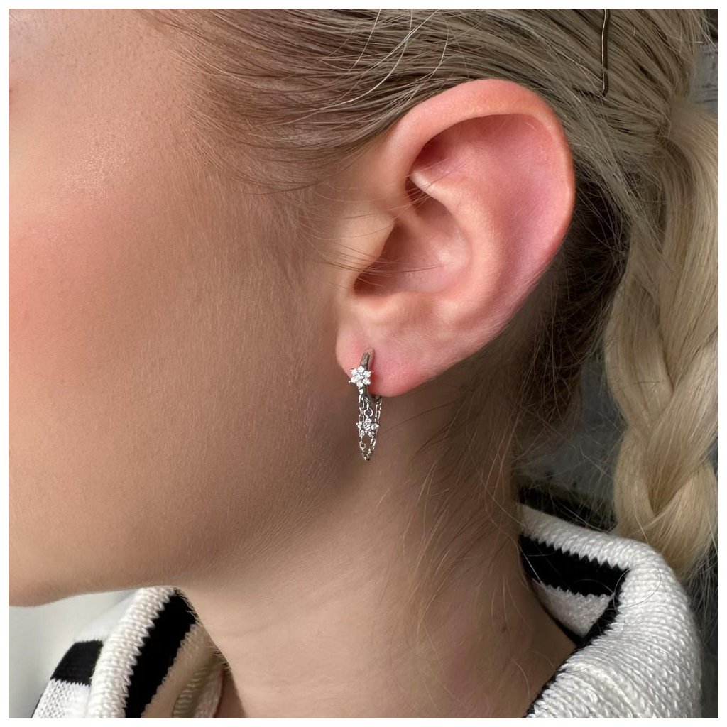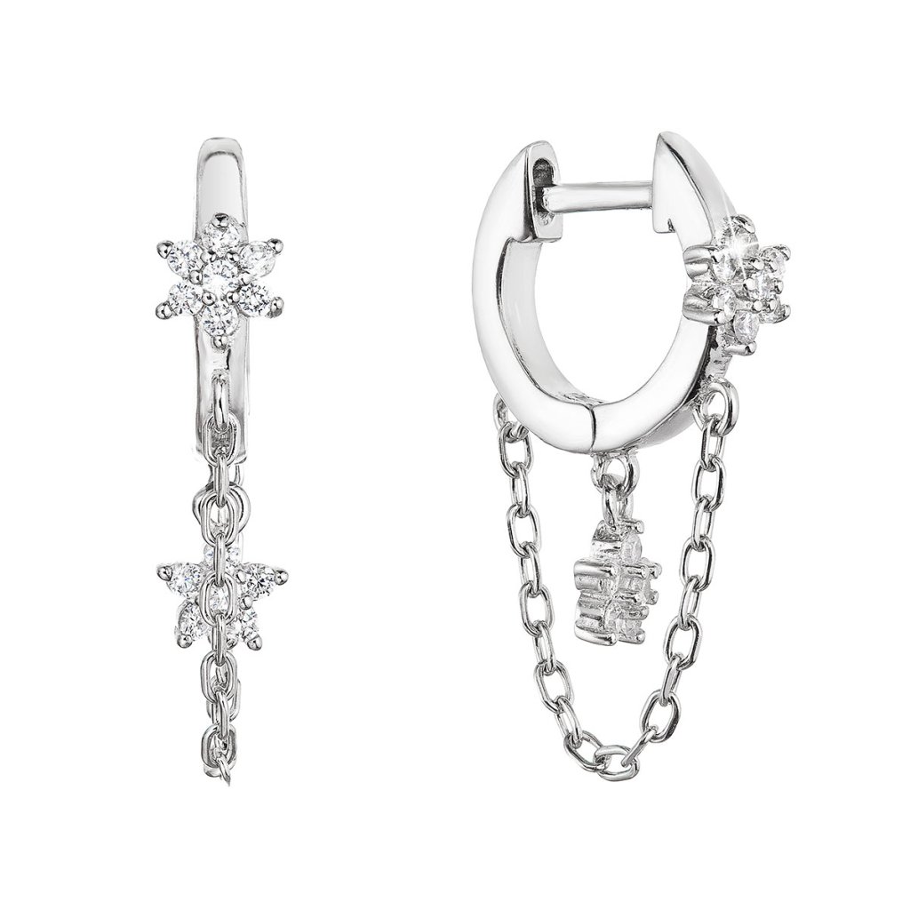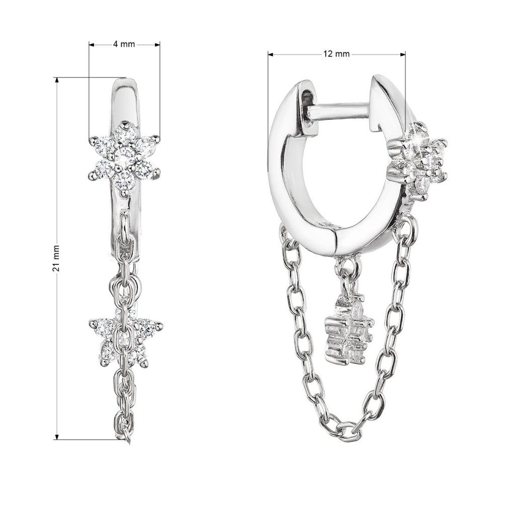 Náušnice v tvare malých krúžkov sú zdobené zavesenou retiazkou a kvietkami vykladanými trblietavými zirkónmi. Šperk je vyrobený z rhodiovaného striebra o rýdzosti 925/1000. Ródium chráni šperk proti černaniu, žltnutiu aj poškriabaniu. Náušnice neobsahujú nikel, a tak ho môžu nosiť aj alergici.