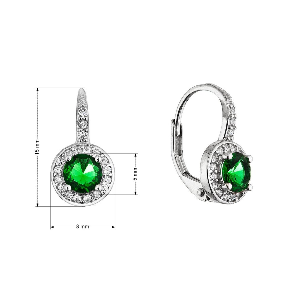 Dominantou náušníc je výrazný zelený zirkón zasadený do stredu, ktorý obklopujú drobné číre kamienky dodávajúce celému šperku oslnivý ligot. Kamienky plynule prechádzajú aj na hornú časť náušníc smerom k praktickému zapínaniu na klapku, čím vytvárajú harmonický a luxusný vzhľad. Visiace prevedenie zaisťuje jemný pohyb pri každom kroku, vďaka čomu náušnice krásne vyniknú.