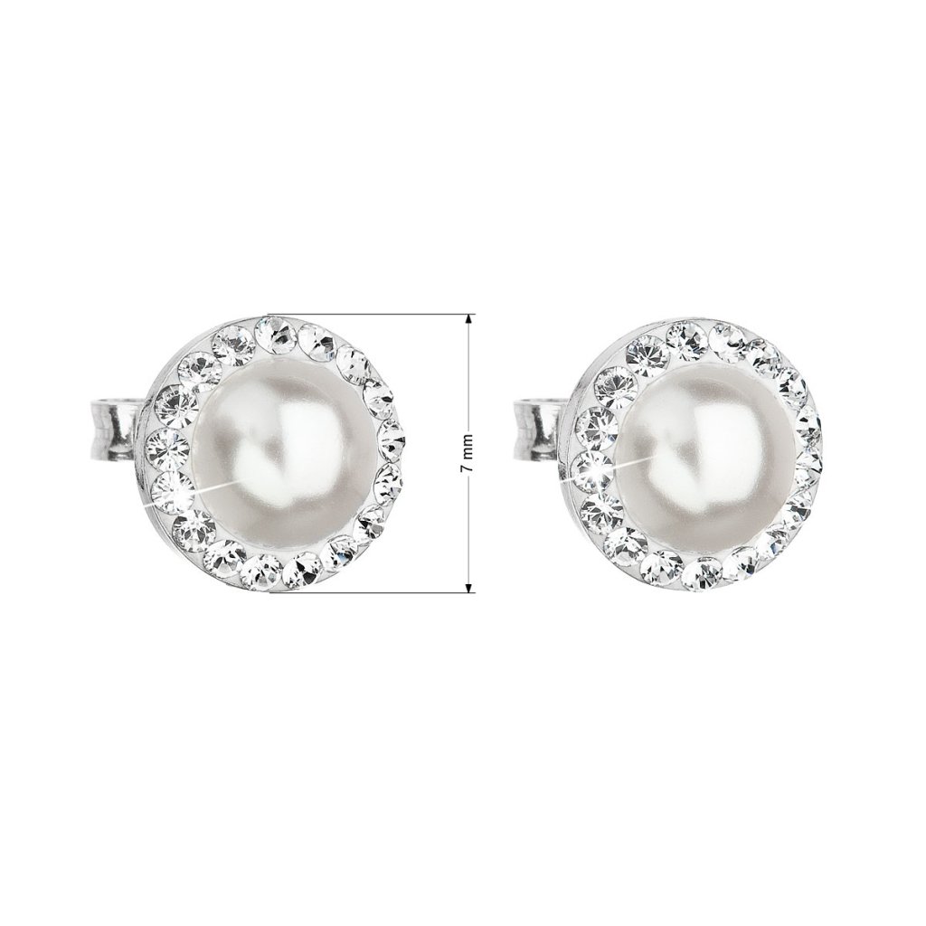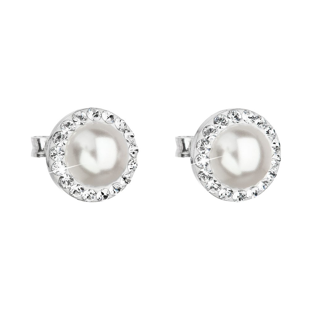 Strieborné náušnice pecka s kryštálmi Swarovski a bielou perlou okrúhle 31214.1