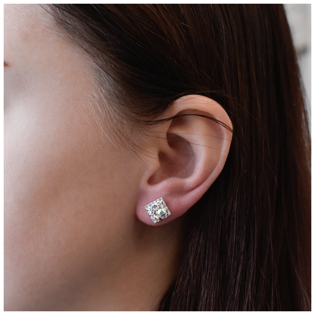 Náušnice sú vysadené mnohými malými Swarovski kryštálmi v bielej farbe s AB efektom. Každý kryštál Swarovski je do šperku jednotlivo ručne vsadený v našej šperkárskej dielni. Do náušníc nie je pridaný nikel, a tak sú vhodné aj pre alergikov .