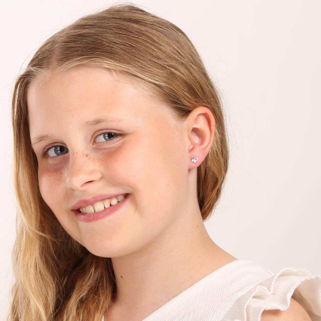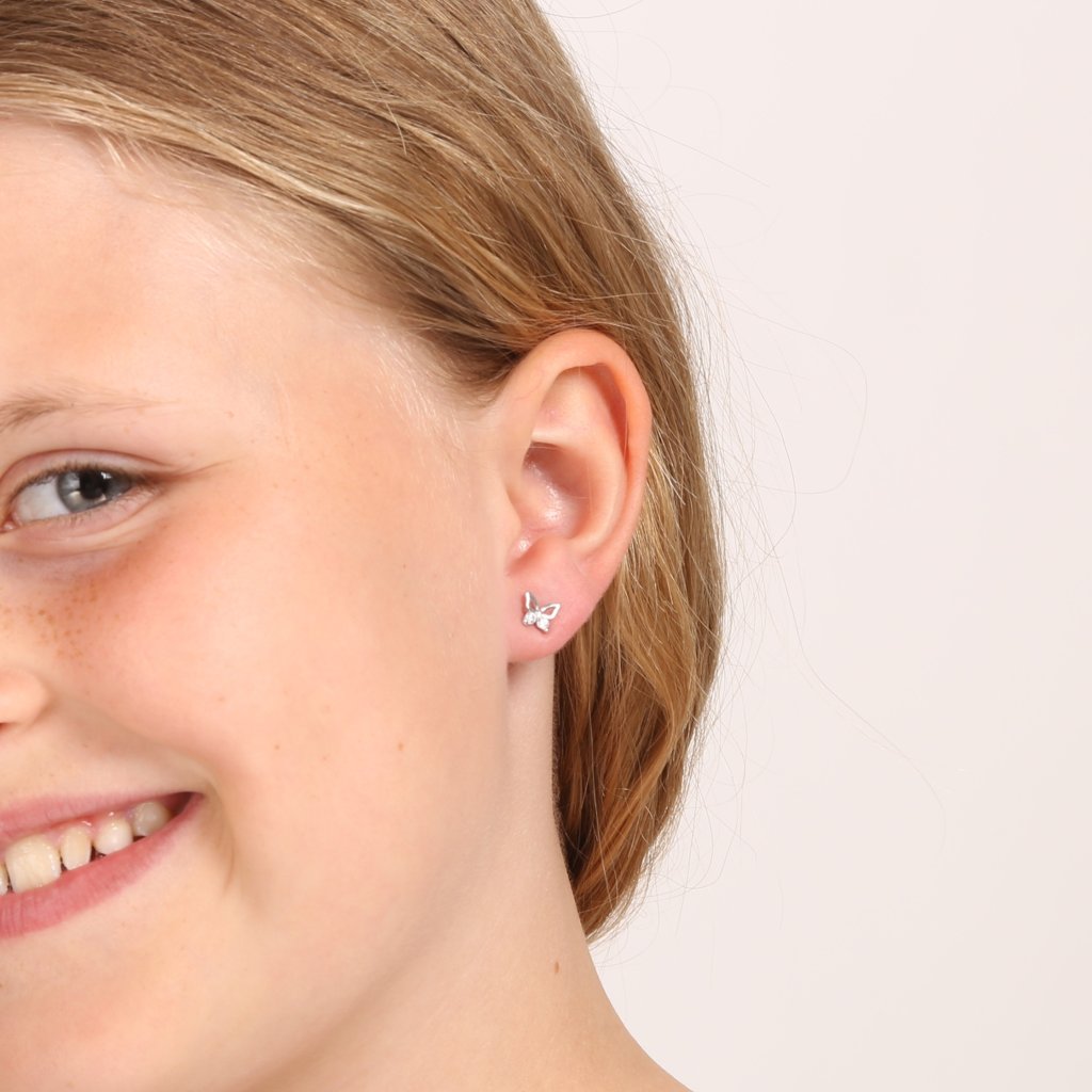 Strieborné náušnice v tvare motýlikov potešia malú slečnu aj dospelú ženu a sú veľmi milým darčekom.Náušnice 11036.1 sú vyrobené zo striebra rýdzosti 925/1000, ktorého povrch je upravený ródiom. Rhodium šperk ochráni proti sčernaniu, zožltnutiu alebo poškriabaniu. Náušnice majú dĺžku 6 mm a zapínajú sa na puzetu. Každá z náušníc je zdobená 2 trblietavými zirkónmi. Keďže náušnice neobsahujú nikel , sú vhodné aj pre alergikov.