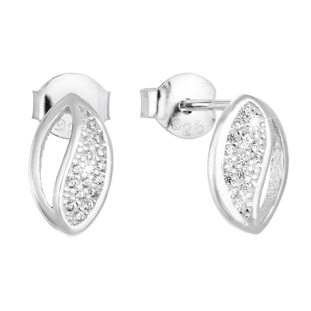 Náušnice 11011.1 typu kôstka v tvare lístkov sú vyrobené zo striebra rýdzosti 925/1000, ktorého povrch je upravený ródiom. Rhodium šperk chráni proti zmenám vzhľadu - sčernanie, zožltnutie alebo poškriabaniu. Náušnice zdobia drobné biele zirkóny zasadené do polovice lístka.