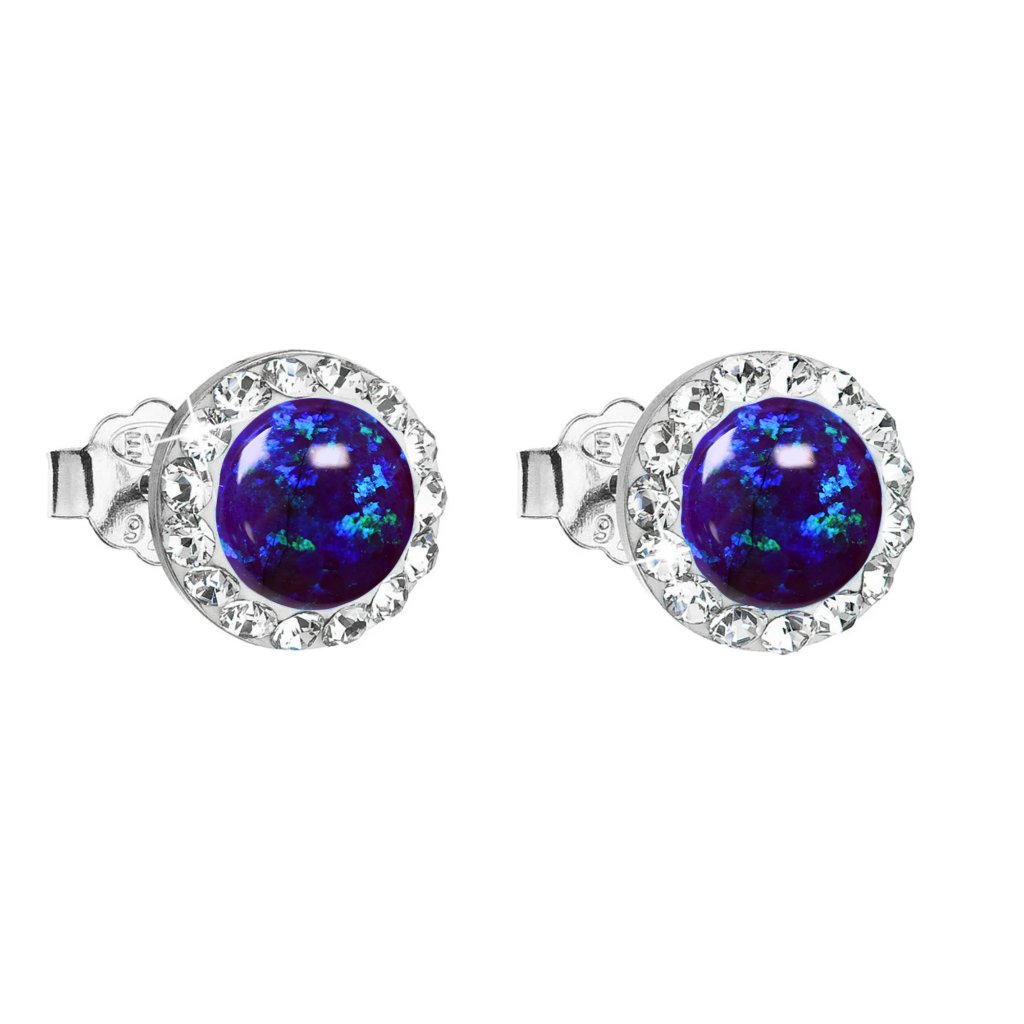 Šperk vo farbách prírody v temne modrofialovej farbe. Tieto strieborné náušnice typu kôstky zdobia okrúhly syntetický opál, ktorý sa na svetlo dúhovo rozžiari v rôznych tónoch modrofialovej. Jemné odlesky dodávajú kameni premenlivú krásu, ktorú dopĺňajú drobné číre kryštály Preciosa zasadené okolo stredu.