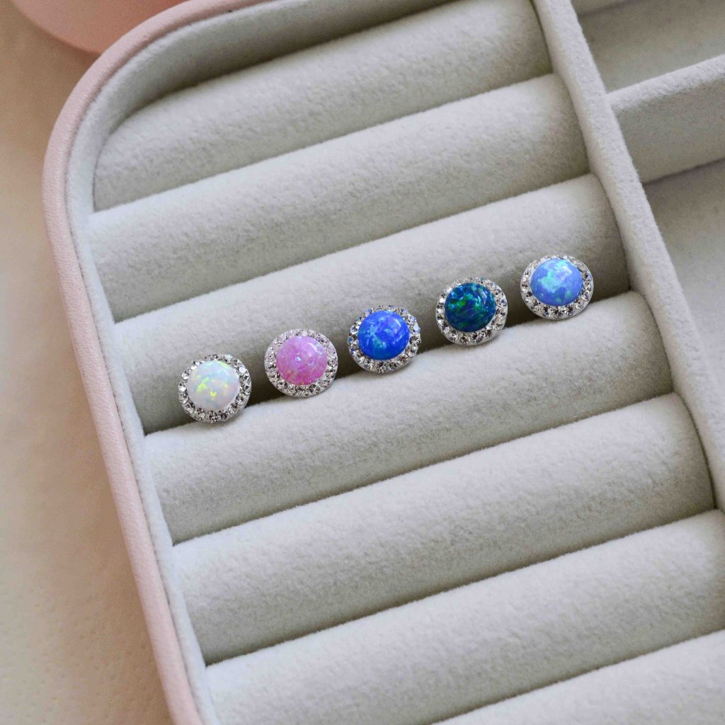 Nežné náušnice typu kôstky v sebe spájajú jemnosť a žiarivú eleganciu . Uprostred každej z nich žiari okrúhly biely opál, ktorého povrch hrá dúhovými odleskami – ako kvapka svetla zachytená v pohybe. Okolo neho sú vysadené drobné číre Preciosa kryštály, ktoré odrážajú svetlo s každým pohybom hlavy.