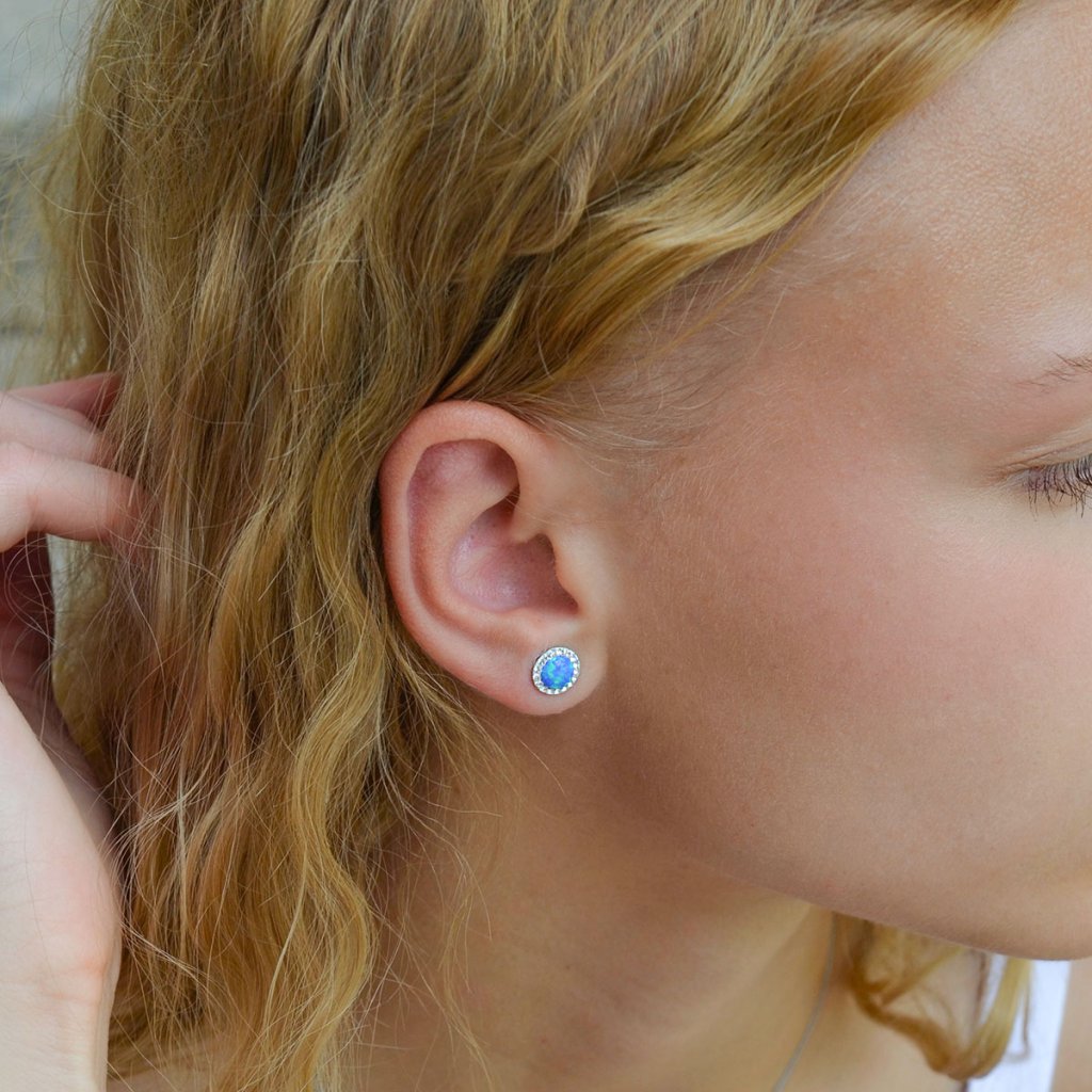 Jemná elegancia, ktorá očarí na prvý pohľad. Tieto strieborné náušnice typu kôstky zdobia okrúhly modrý syntetický opál, ktorého povrch sa leskne v tónoch oceánskej modrej a dúhových zábleskov – ako hra svetla na vodnej hladine. Krásu kameňa podčiarkujú drobné číre kryštály Preciosa, ktoré sa rozžiaria pri každom pohybe.