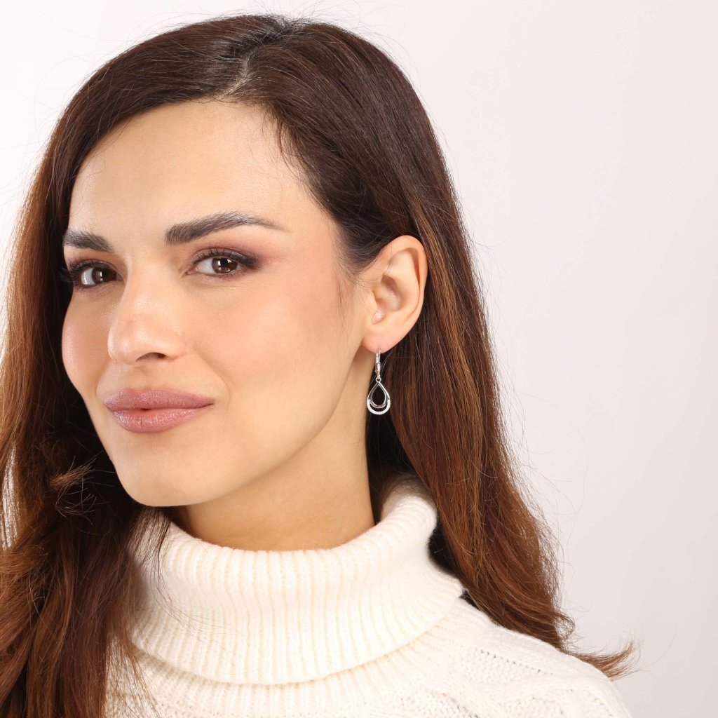 Tieto nádherné visiace strieborné náušnice sú spracované v tvare elegantnej slzy, ktorý dodáva vášmu outfitu jemný a sofistikovaný vzhľad.Náušnice sú vyrobené zo striebra o rýdzosti 925/1000 a sú opatrené vrstvou ródia , ktorá šperk ochráni pred sčernením, zožltnutím alebo poškriabaním . Navyše sú zdobené krásnymi zirkónovými kameňmi , ktoré jemne žiaria a priťahujú pozornosť.