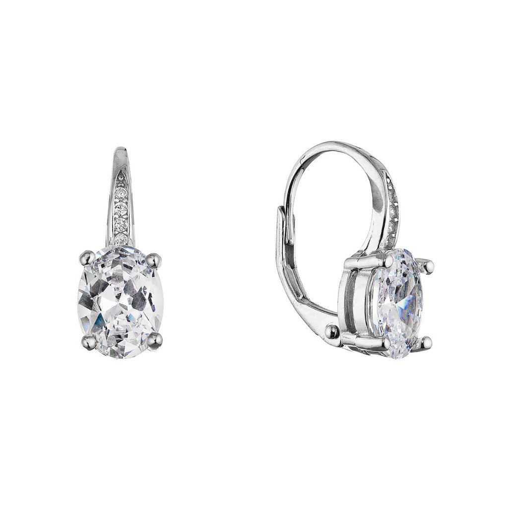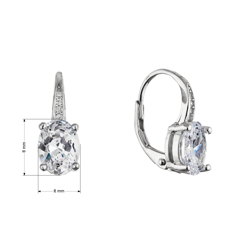 Náušnice majú elegantný oválny tvar , ktorého stred zdobí väčší oválny číry zirkón v bielej farbe. Nad týmto dominantným kameňom sú vsadené štyri menšie číre kamienky, ktoré dodávajú šperku jemný ligot a zvýrazňujú jeho sofistikovaný vzhľad. Zapínanie na klapku zaisťuje pohodlné a bezpečné nosenie po celý deň.
