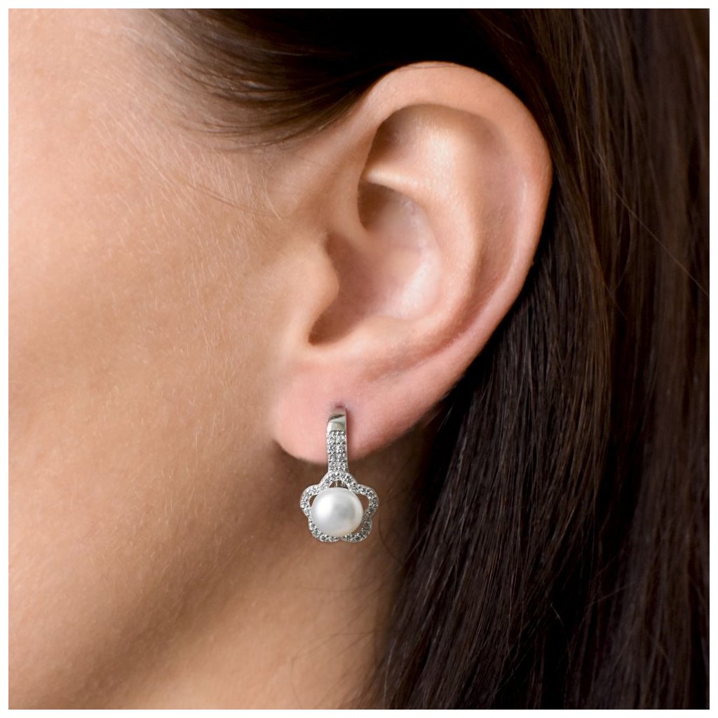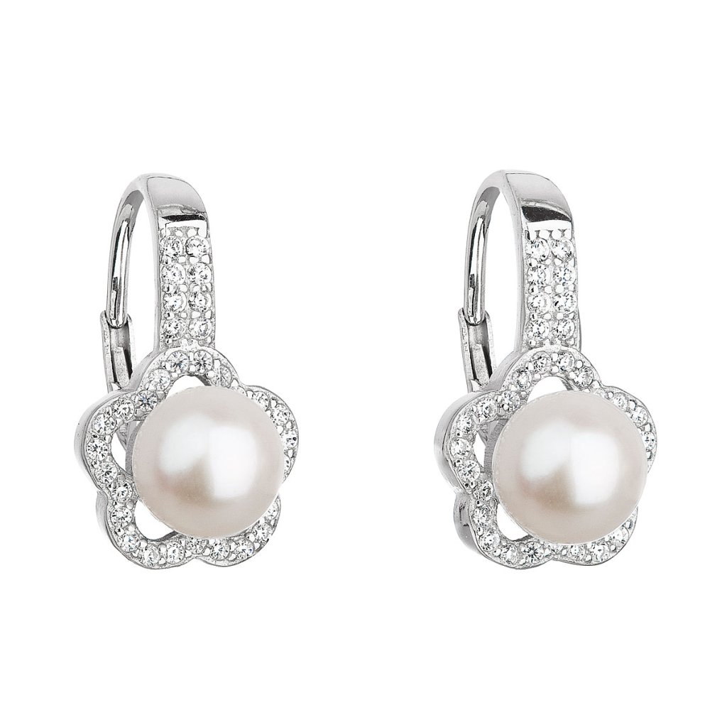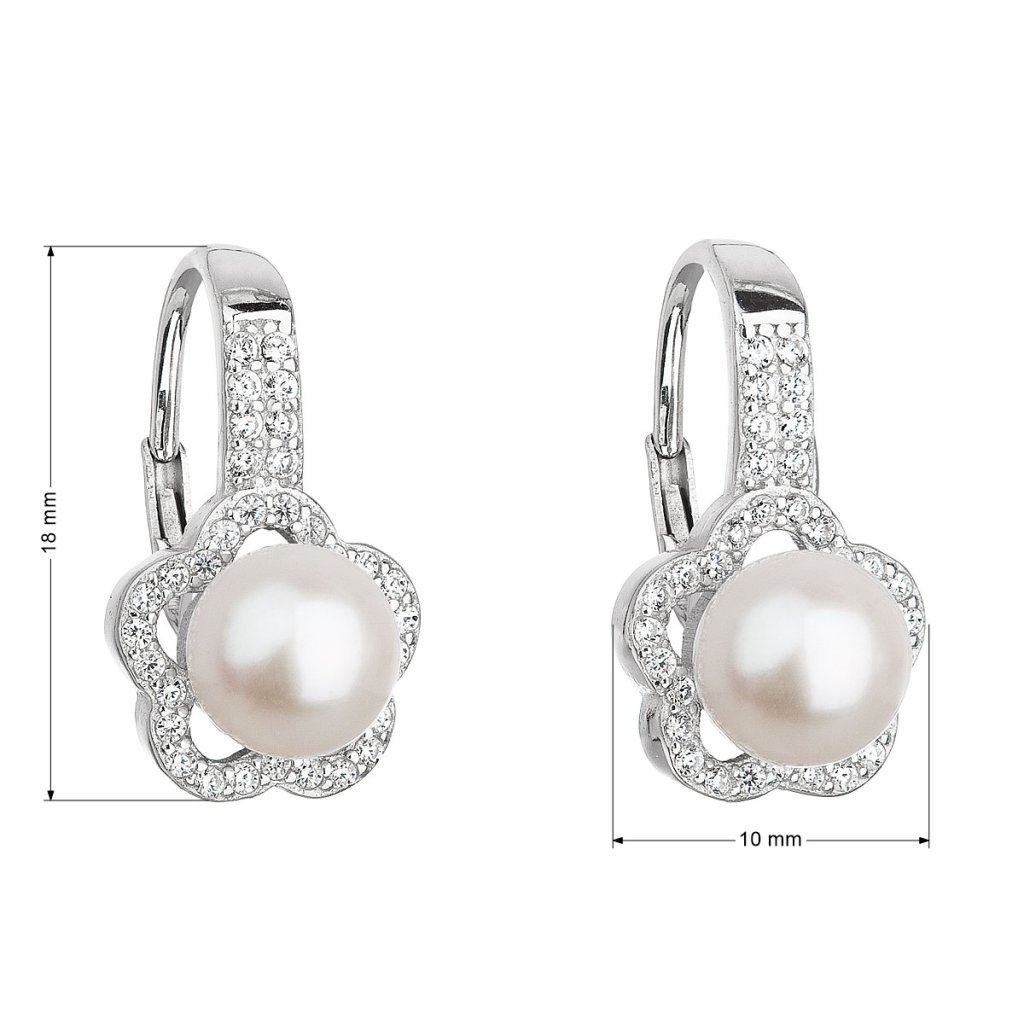 Precízne spracované strieborné náušnice v tvare kvietkov zdobené bielou okrúhlou perlou a trblietavými zirkónmi krásne rozžiaria vaše uši!