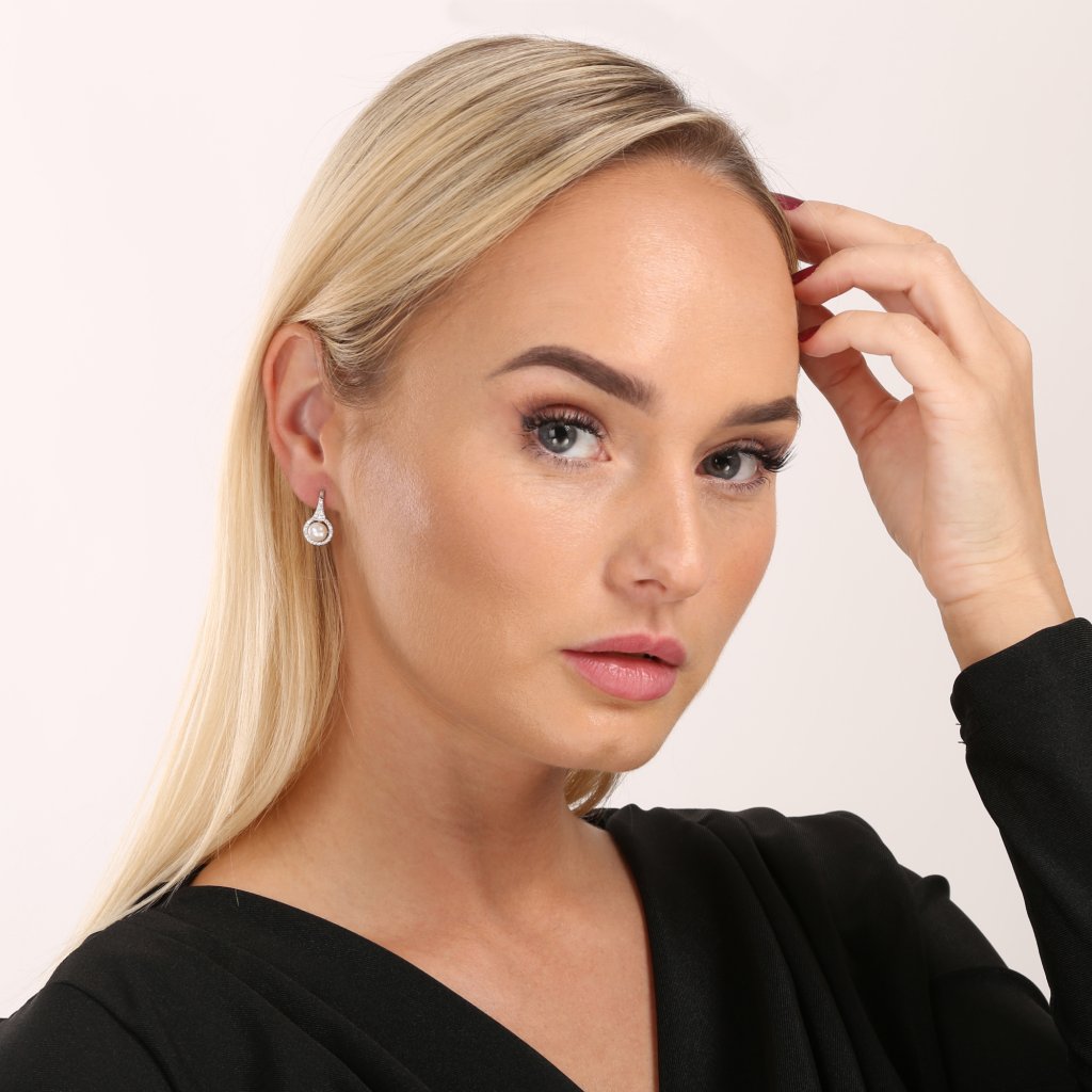 Luxusné perlové náušnice vysadené mnohými trblietavými zirkónmi budú na vašich ušiach neprehliadnuteľné.