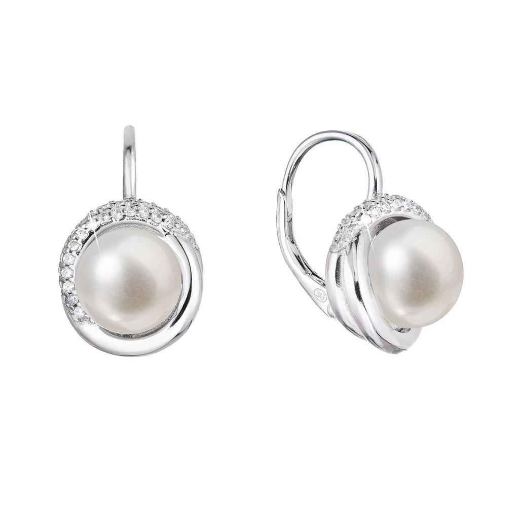 Strieborné náušnice visiace s bielou riečnou perlou a zirkónmi okrúhle 21075.1