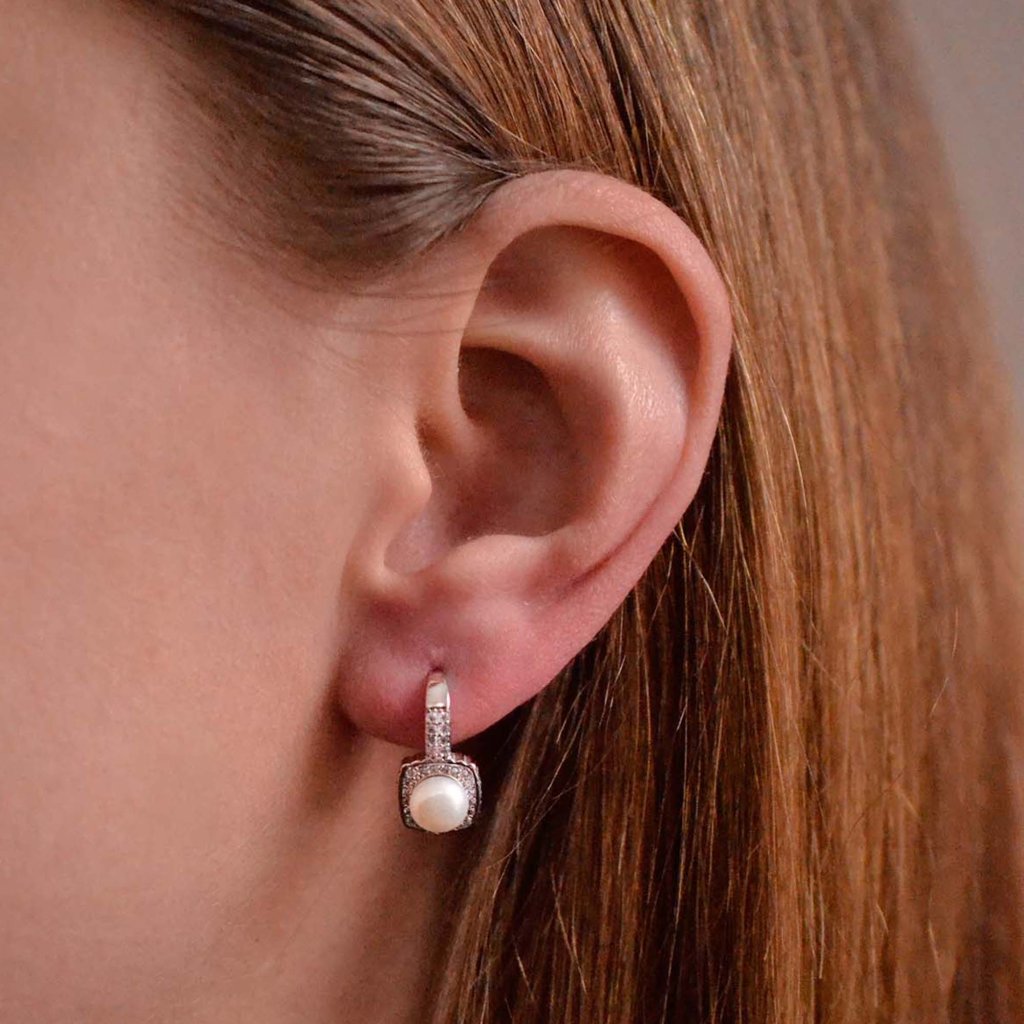 Náušnice 21073.1 sú vyrobené zo striebra rýdzosti 925/1000 s povrchovou úpravou ródiom a zdobia ich okrúhle biele riečne perly kvality AA . Perly majú priemer 5,5-6 mm, sú vsadené do štvorca, ktorý je vysadený čírymi zirkónmi a tak sa celé pekne trblietajú. Náušnice sa zapínajú na klasickú klapku. Keďže šperk neobsahuje žiadny prídavok niklu, môžu ho bez obáv nosiť aj alergici.
