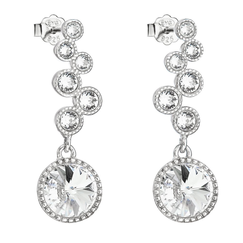 Strieborné náušnice visiace s kryštálmi Swarovski biele okrúhle 31265.1