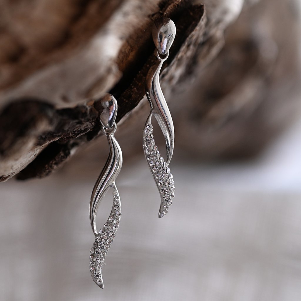 K plesovým šatám často vyberáme výrazné dlhé náušnice, ktoré náš slávnostný outfit nádherne doplnia. Vyskúšajte dlhé visiace náušnice so Swarovski kryštálmi v tvare vlnky!
