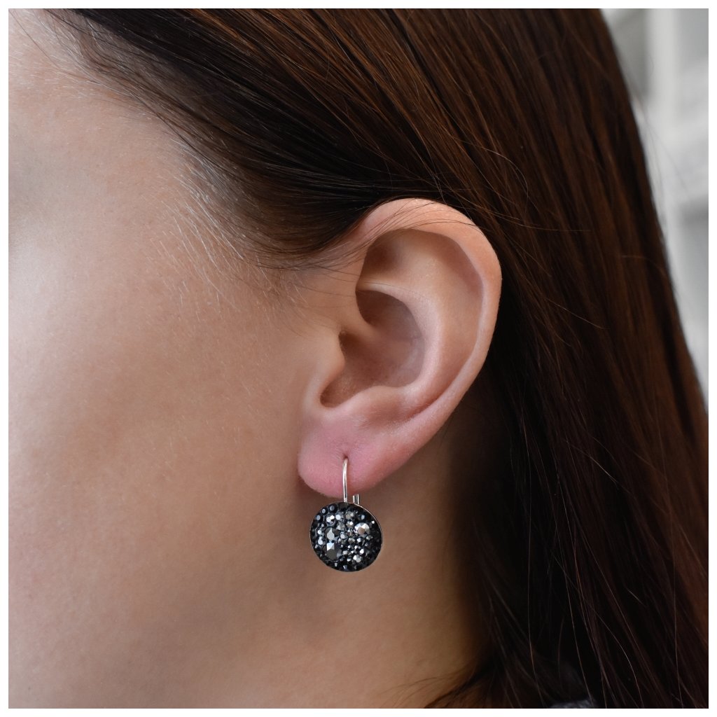 Strieborné okrúhle visiace náušnice 31176.5 hematite septembra mnohých Swarovski kryštály. Čierna farba kryštálov korešponduje s rhodiovaným striebrom 925/1000, z ktorého sú náušnice vytvorené. Rhodium udrží šperk v skvelej forme - bez zažltnutia aj sčernania. Zároveň chráni náušnice 31176.5 hematite proti poškriabaniu. Šperk neobsahuje nikel, je teda vhodným darčekom aj pre alergikov.