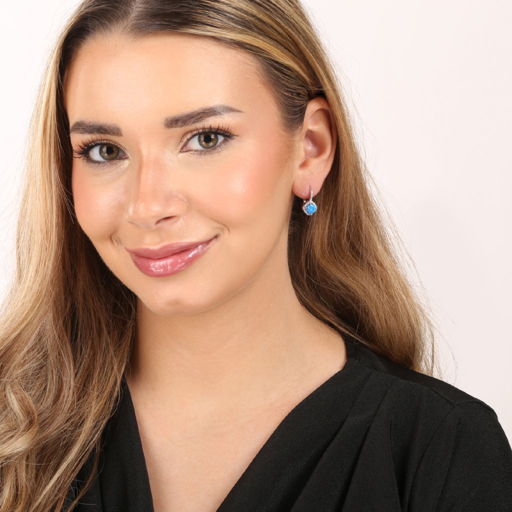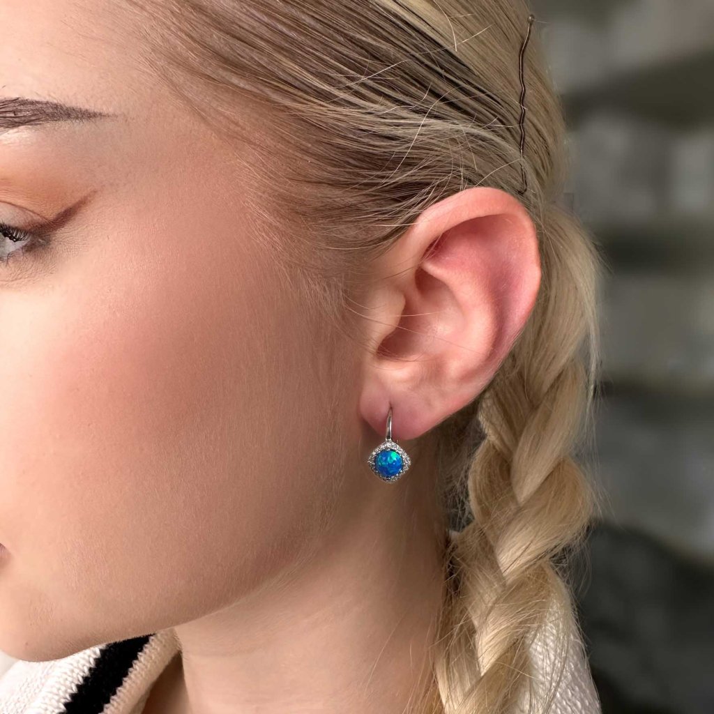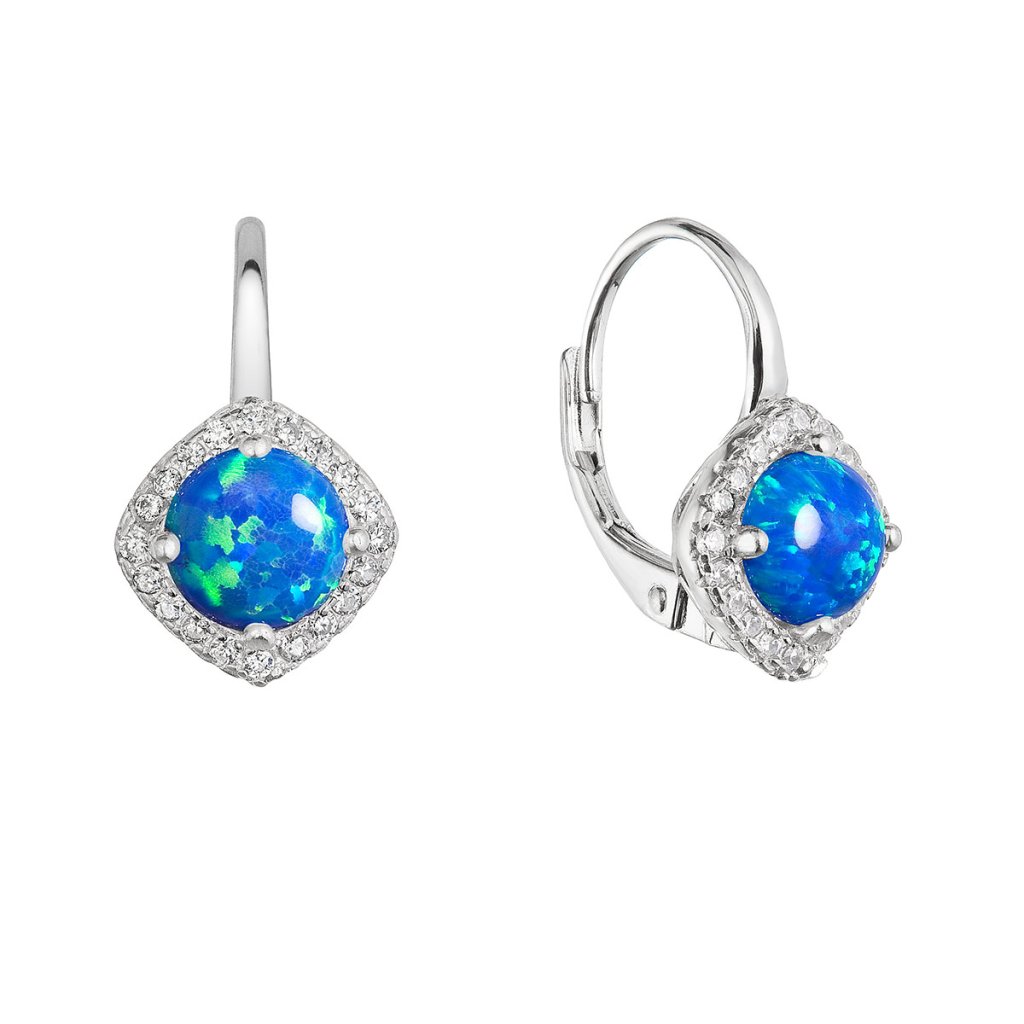 Strieborné náušnice s modrým okrúhlym syntetickým opálom bohato zdobené bielymi zirkónmi spríjemné každú oslavu aj obyčajný deň.Visiace náušnice vyrábame zo striebra rýdzosti 925/1000, ktoré je upravené ródiom. Vďaka ródiu je šperk odolný proti sčernaniu, zožltnutiu alebo poškriabaniu. Náušnice tvoria jeden okrúhly syntetický opál v modrej farbe a okolo opálu sú do tvaru kosoštvorca usadené biele zirkóny.