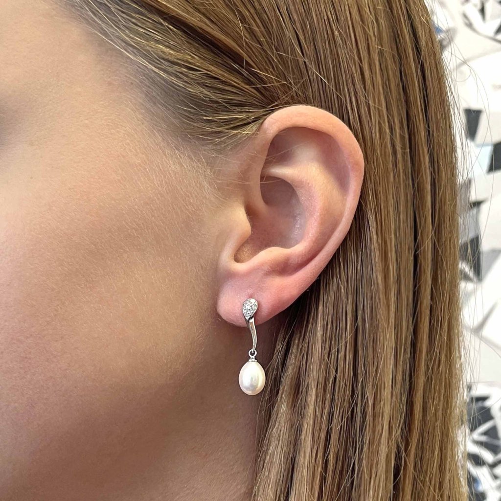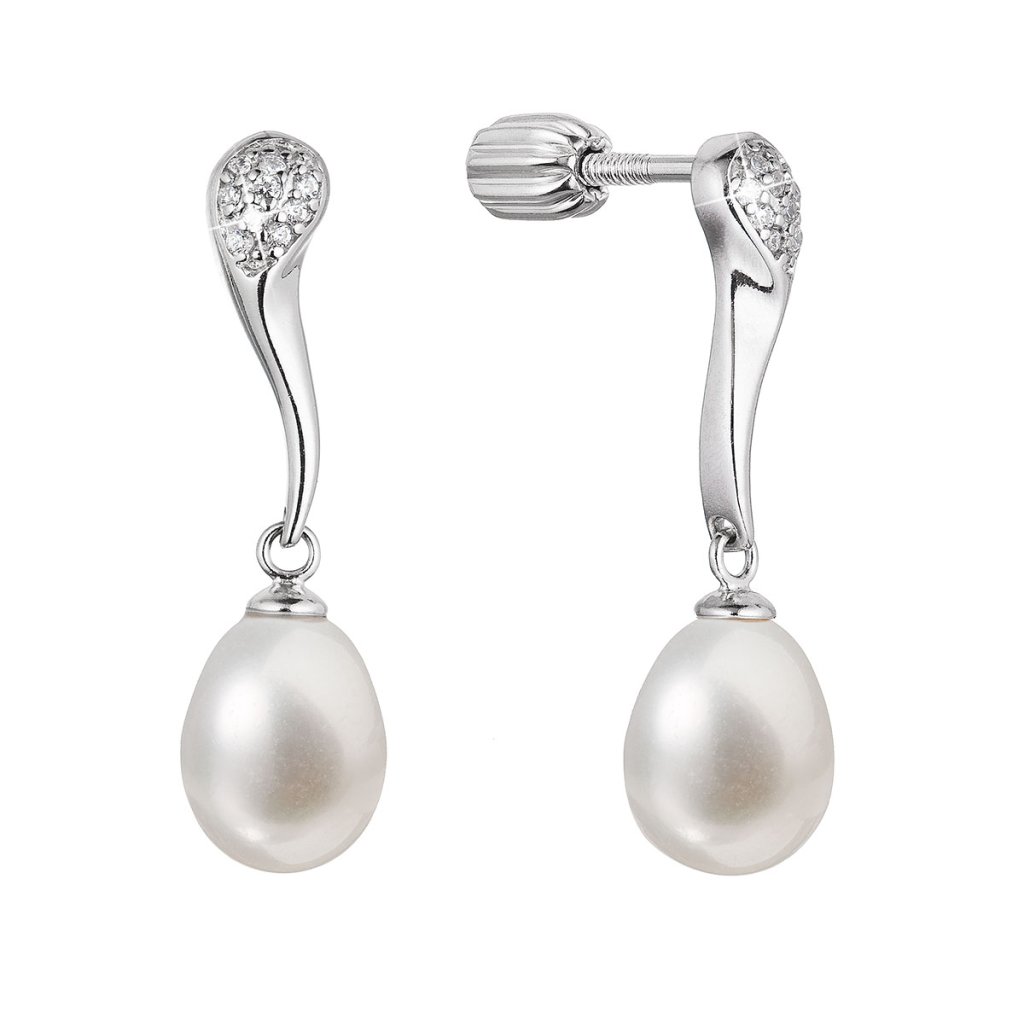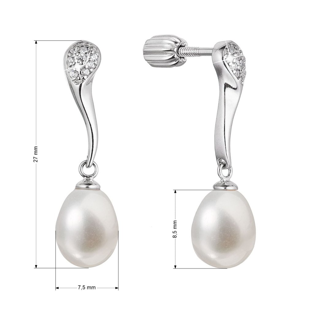 Strieborné náušnice s pohyblivou bielou riečnou perlou a trblietavými zirkónmi sú očarujúce.Náušnice 21097.1B sú vyrobené zo striebra o rýdzosti 925/1000 vrátane povrchovej úpravy ródiom. Ródium ochráni šperk proti sčerneniu, zožltnutiu i poškriabaniu. Biele riečne perly sú oválneho tavru o veľkosti 8,5 x 7,5 mm a kvality AA . Náušnice sú navyše zdobené aj niekoľkými priezračnými zirkónmi, ktoré ich krásne rozžiaria. Šperk neobsahuje prídavok niklu, a tak ho môžu nosiť aj ľudia náchylní na alergické reakcie. Náušnice majú zapínanie na balónik , ktorý ich ochráni proti nechcenej strate.
