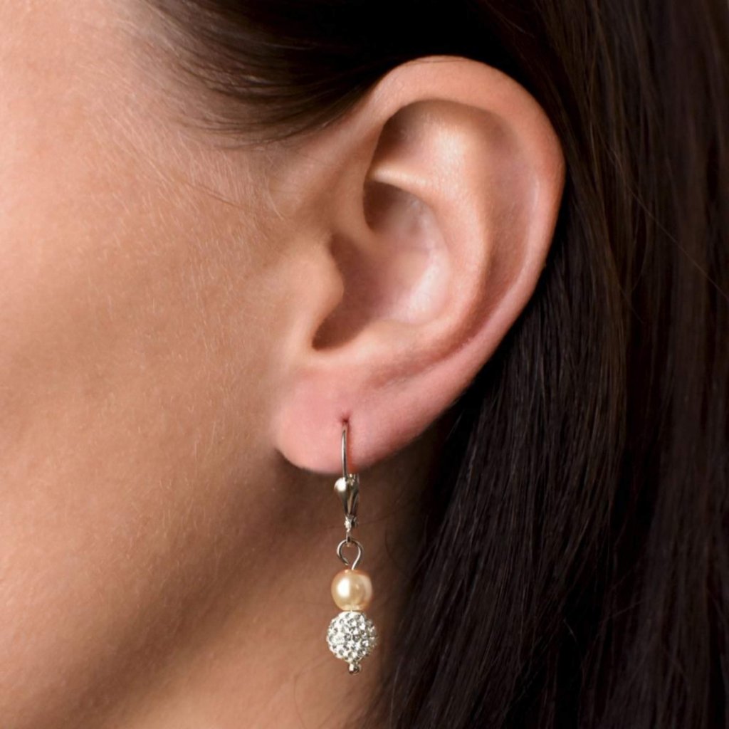 - dlhé visiace náušnice s guľatou perlou a Preciosa kryštály
