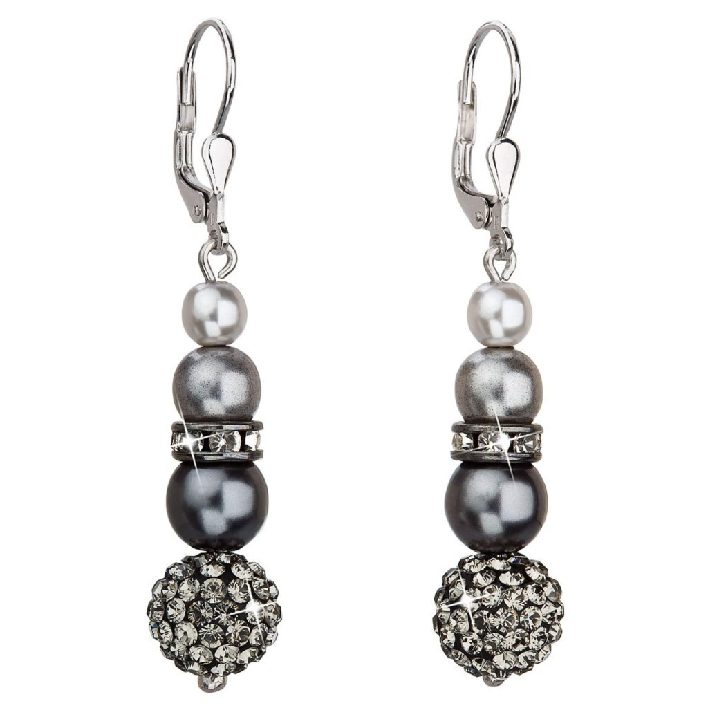 Strieborné náušnice visiace so syntetickými perlami a Preciosa kryštály šedé okrúhle 31149.3