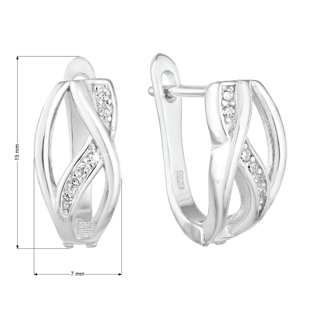 Visiace náušnice 11243.1 sú vyrobené zo striebra rýdzosti 925/1000 , na ktorého povrchu je ródium. Rhodium šperk ochráni proti sčernaniu, zožltnutiu alebo poškriabaniu. Náušnice majú dĺžku 15 mm . Tvoria ich tri prepletajúce sa vlnky, kde prostredná je vysadená bielymi zirkónmi.
