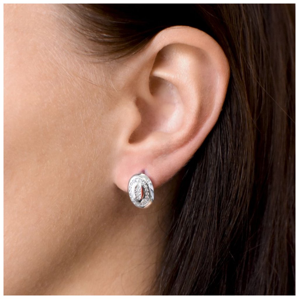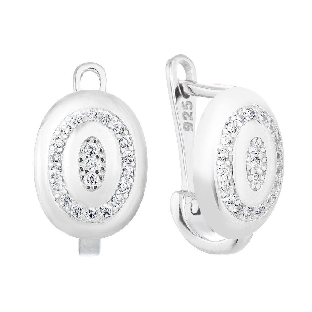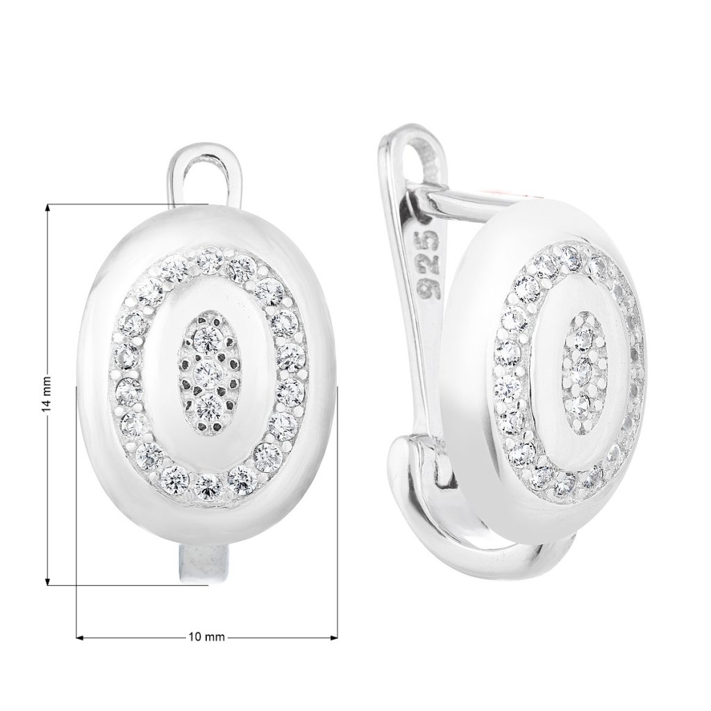 Bohaté zdobenie drobnými bielymi zirkónmi dodá náušniciam ten správny ligot a šmrnc. Zapínanie náušníc je tvorené na ruský patent.