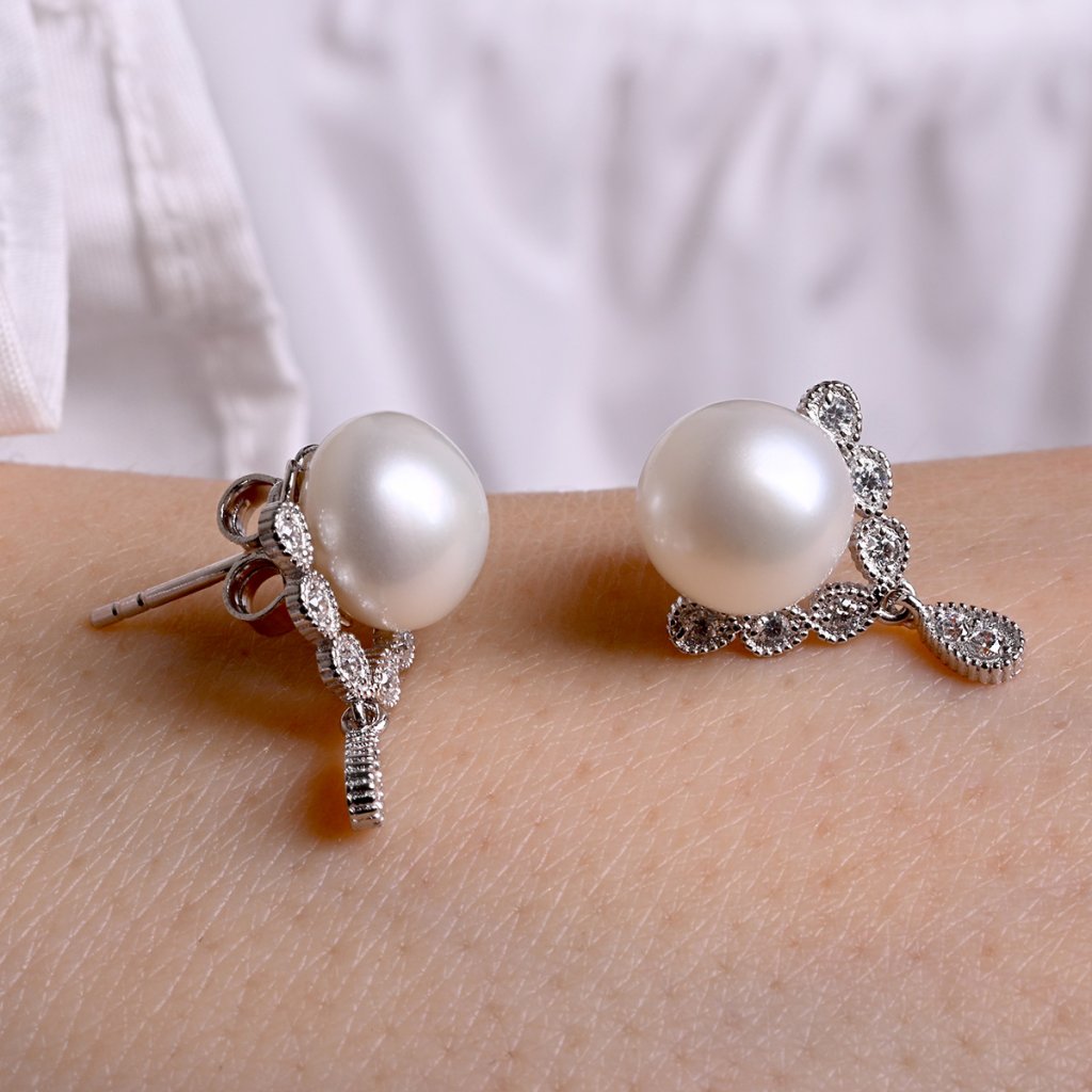 Perly kvality AA s priemerom 8,5 mm dodávajú šperku nadčasovú krásu. Pod perlou sa nachádza strieborný trojuholníček so zavesenou kvapôčkou, zdobený zirkónmi, čo dodáva náušniciam jedinečný vzhľad.