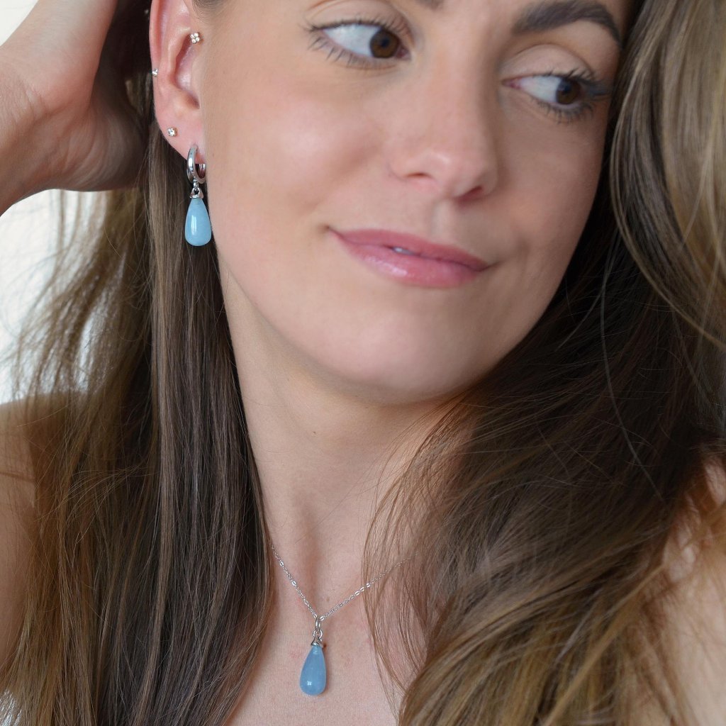 Náušnice sú vyrobené zo striebra rýdzosti 925/1000 s ródiovou povrchovou úpravou, ktorá dodáva šperku luxusný strieborný lesk a zároveň chráni pred sčernením a poškriabaním. Ich jedinečný dizajn kombinuje jemnosť a dynamiku – pravý akvamarín v tvare nežnej kvapky sa pri každom pohybe ľahko pohupuje, čím vytvára elegantný a živý šperk. Náušnice majú spoľahlivé zapínanie na krúžok.