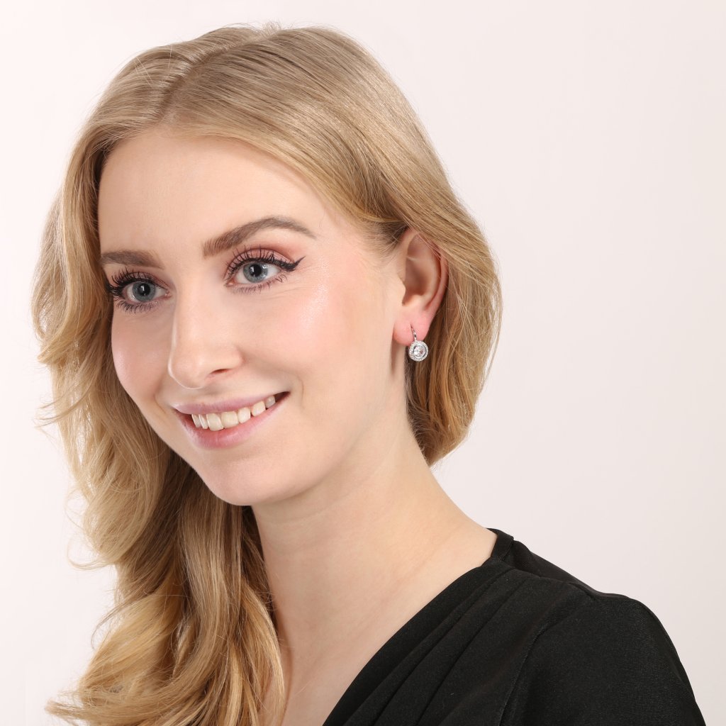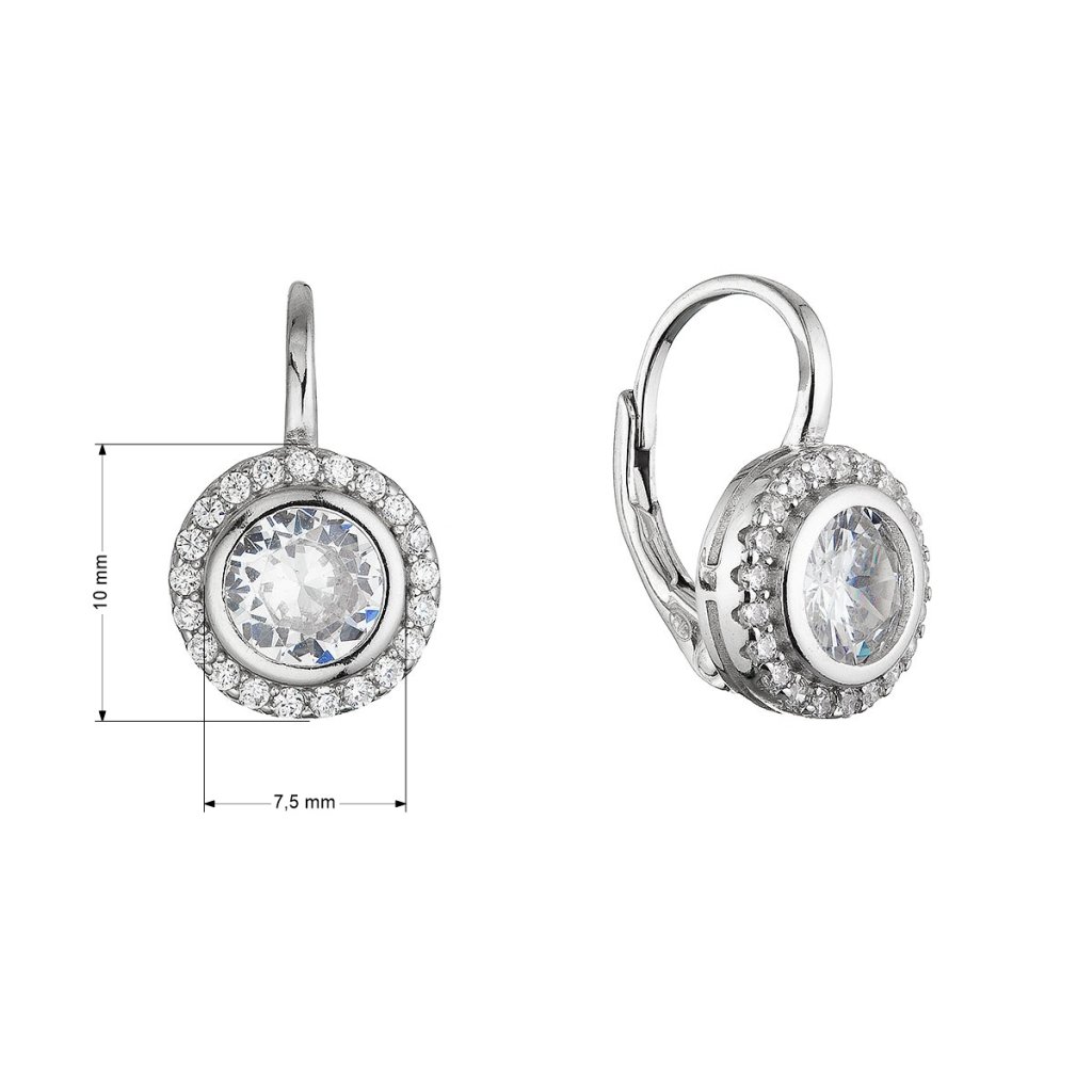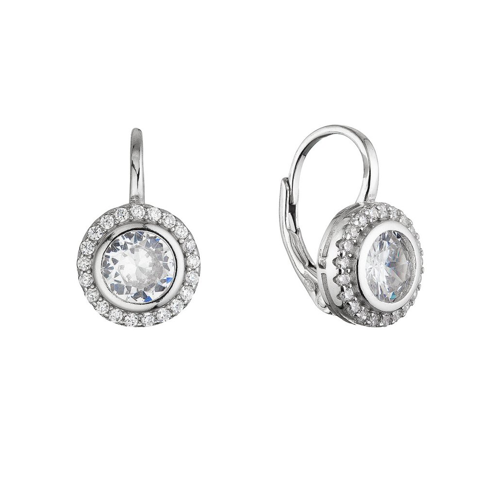 Strieborné visiace náušnice 11639.1 o rýdzosti 925/1000 s ródiovou úpravou okúzlia svojim premysleným a žiarivým dizajnom. Okrúhly tvar náušníc zdobí uprostred dominantný číry kryštál , ktorý je precízne zasadený a elegantne ohraničený.