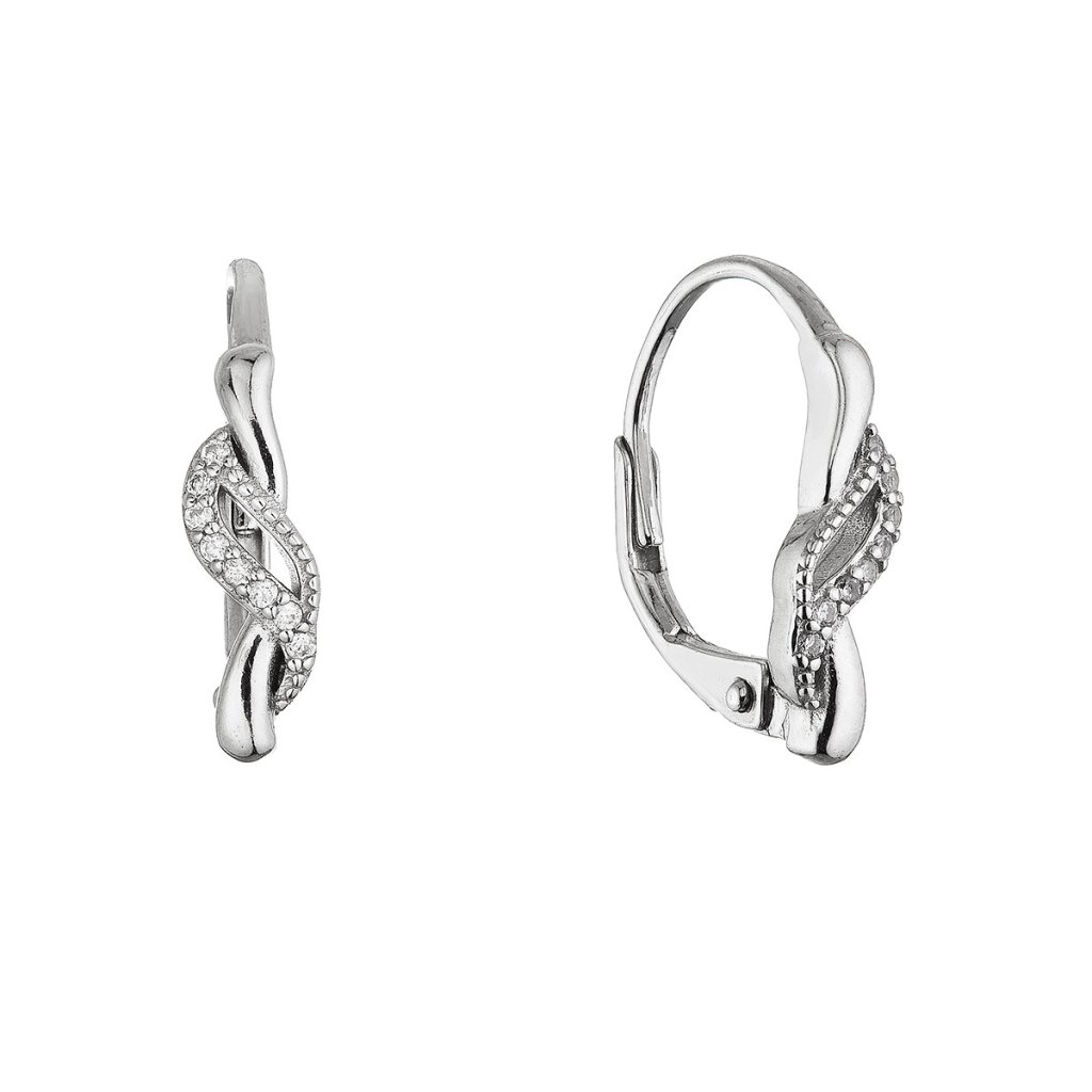 Strieborné visiace náušnice 11671.1 s rýdzosťou 925/1000 a ródiovou úpravou zaujmú svojim originálnym dizajnom inšpirovaným ladným pohybom vĺn. Náušnice tvoria dve nadväzujúce časti – prvá jednoduchá vlna vedie vodorovne, zatiaľ čo druhá, dynamickejšia, sa v polovici rozdvojuje do dvoch samostatných línií, ktoré sa neskôr znovu spájajú. Každá vlnka je vysadená precízne brúsenými čírymi kamienkami vo farbe crystal rôznych veľkostí, čo vytvára efektnú hru svetla a dodáva šperku luxusný ligot.