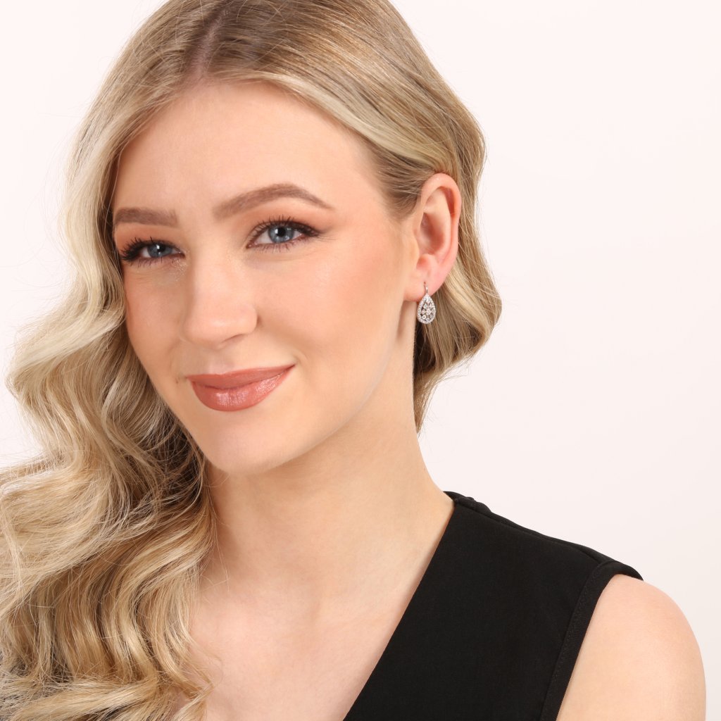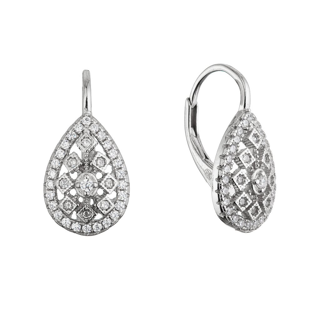 Strieborné visiace náušnice 925/1000 s ródiovou úpravou zaujmú svojim sofistikovaným dizajnom v tvare kvapky, ktorý v sebe spája eleganciu s precíznym spracovaním. Po celom obvode kvapky sú vysadené drobné číre kamienky, ktoré dodávajú šperkom jemný lesk.