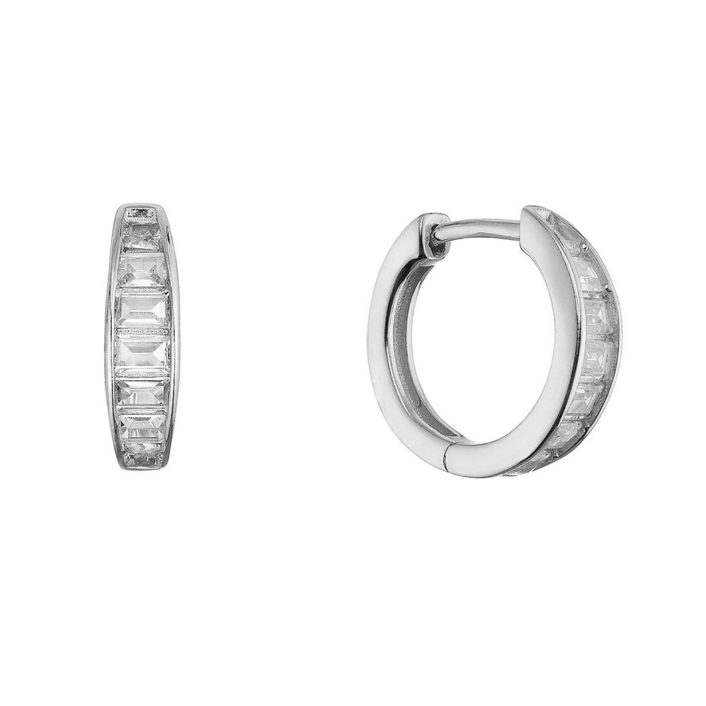 Kruhové náušnice sú precízne spracované zo striebra rýdzosti 925/1000 s ródiovou povrchovou úpravou, ktorá zaistí dlhotrvajúci lesk a odolnosť. Kruhy sú vysadené zirkónmi brúsenými do obdĺžnikového tvaru zvaného baguette . Tento elegantný brus vyniká čistými líniami a krásne odráža svetlo, takže náušnice pôsobia luxusne. Zapínanie na krúžok zaistí pohodlné a spoľahlivé nosenie.