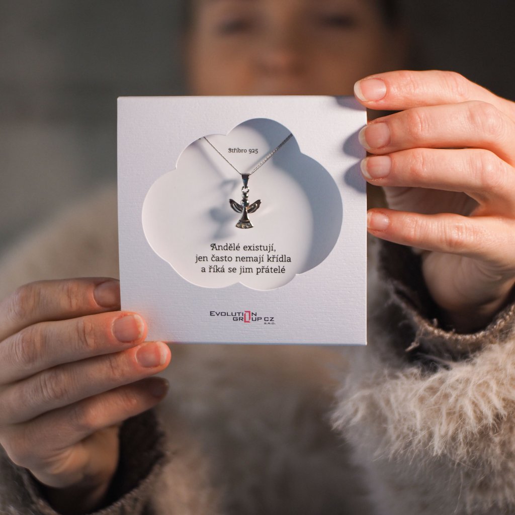 Na retiazke je zavesený strieborný prívesok v tvare anjela s krídlami, navyše je zdobený bielymi Swarovski kryštálmi.