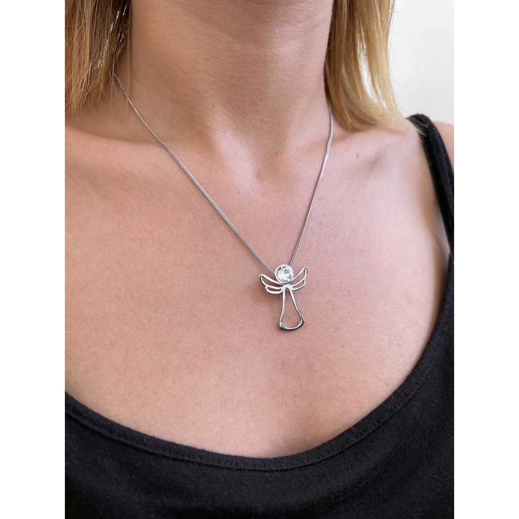 Na retiazke je zavesený prívesok v tvare anjela so žiarivým Swarovski kryštálom bielej farby .