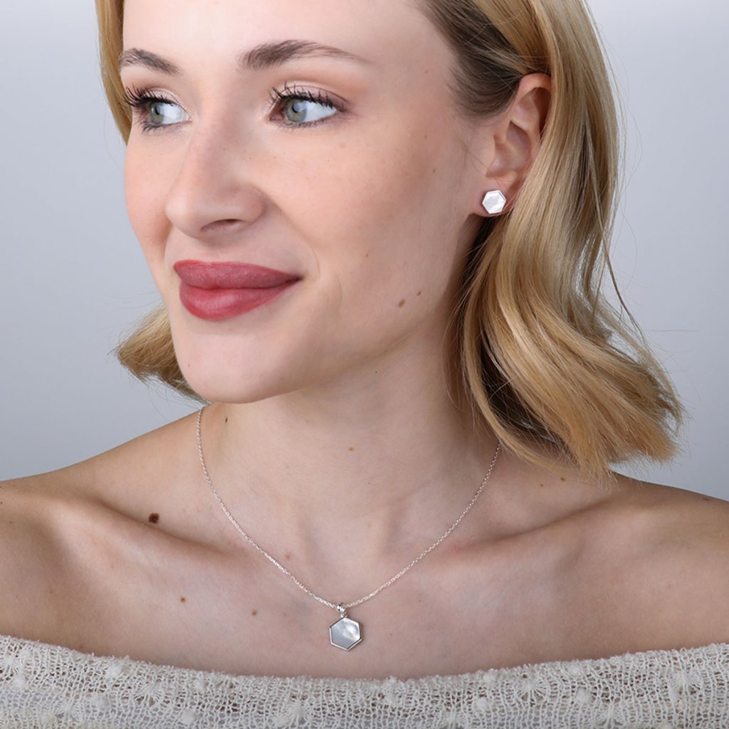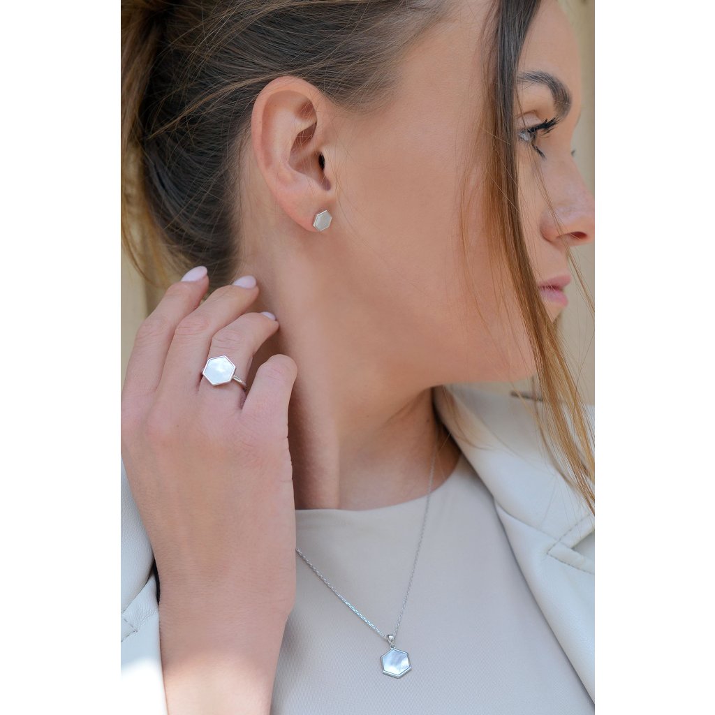Centrálny hexagón z rýdzeho striebra 925/1000 je vyplnený luxusnou bielou perleťou , ktorá hrá všetkými odtieňmi meniacimi sa podľa uhla pohľadu.