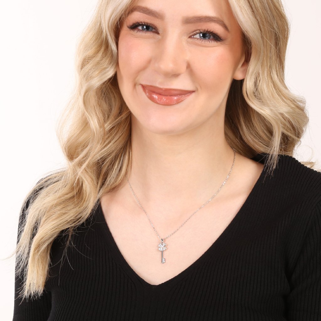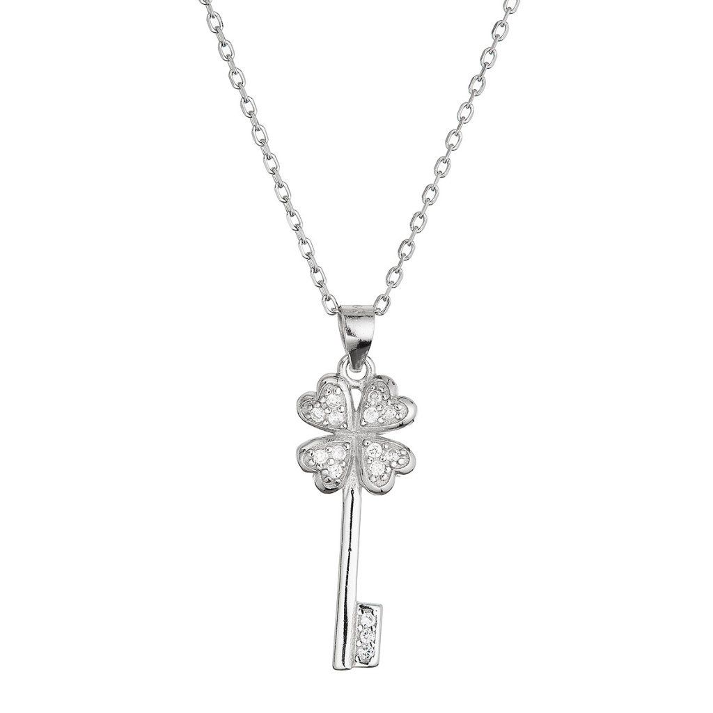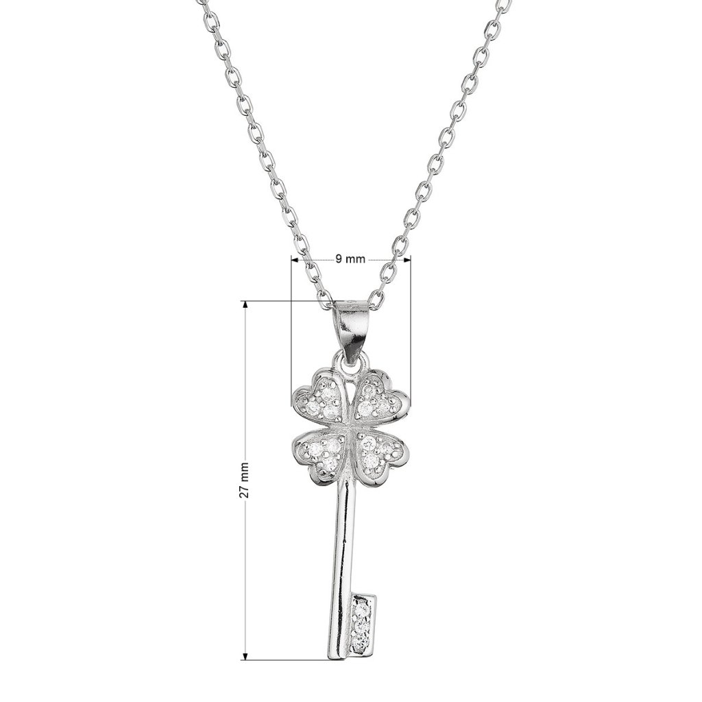 Strieborný náhrdelník v tvare kľúča s motívom štvorlístka je originálnym šperkom, ktorý v sebe spája symboliku šťastia a otvoreného srdca . Horná časť kľúča je jemne navrhnutá do tvaru štvorlístka – tradičného talizmanu pre šťastie – a celkový dizajn je doplnený trblietavými zirkónmi, ktoré dodávajú šperku eleganciu a lesk.