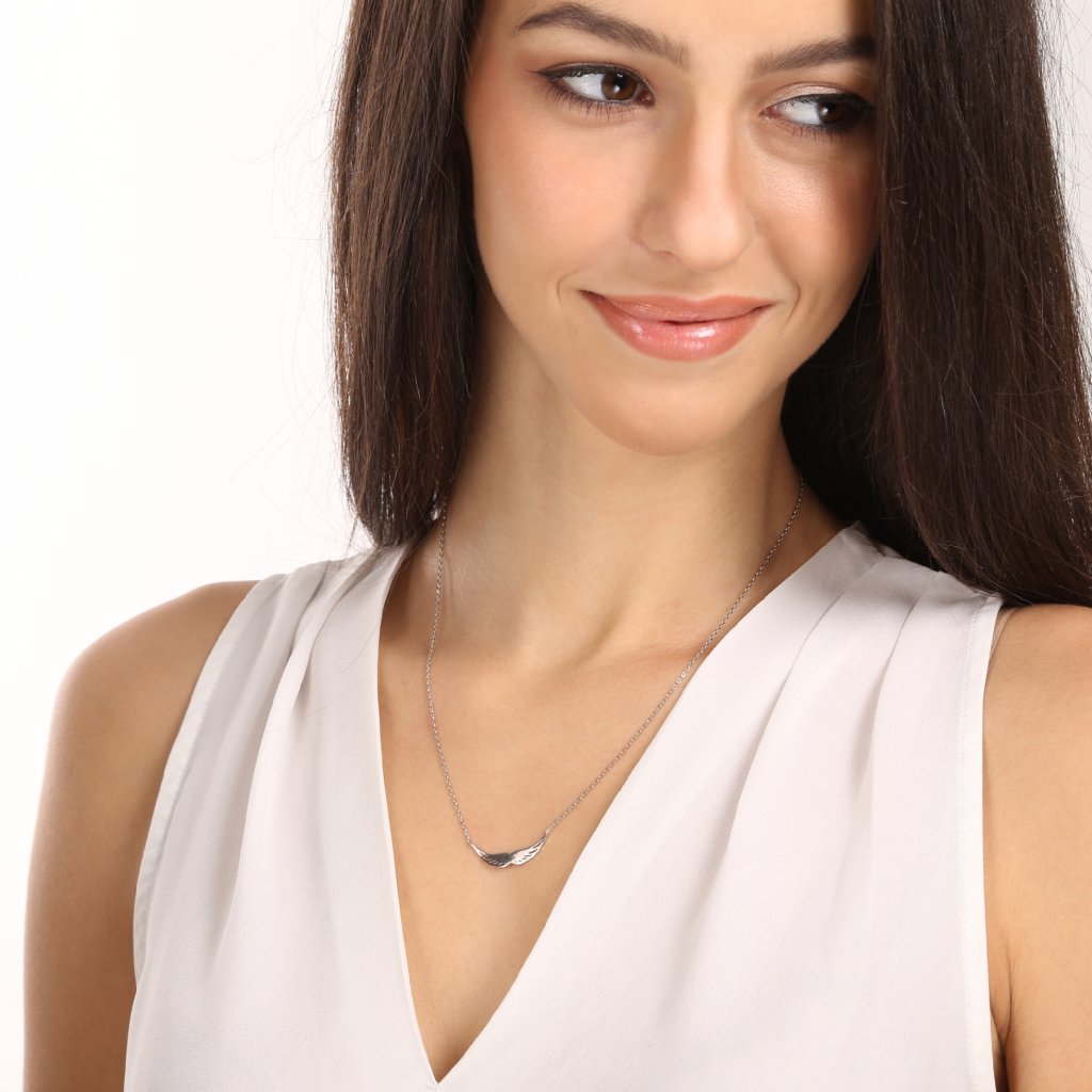 Náhrdelník s jemným motívom anjelských krídiel je symbolom ochrany a nádeje. Krídla zavesené na striebornej retiazke budú nežne lemovať váš dekolt.Náhrdelník je vyrobený zo striebra o rýdzosti 925/1000 a je opatrený vrstvou ródia , ktorá šperk ochráni pred sčernením, zožltnutím alebo poškriabaním.
