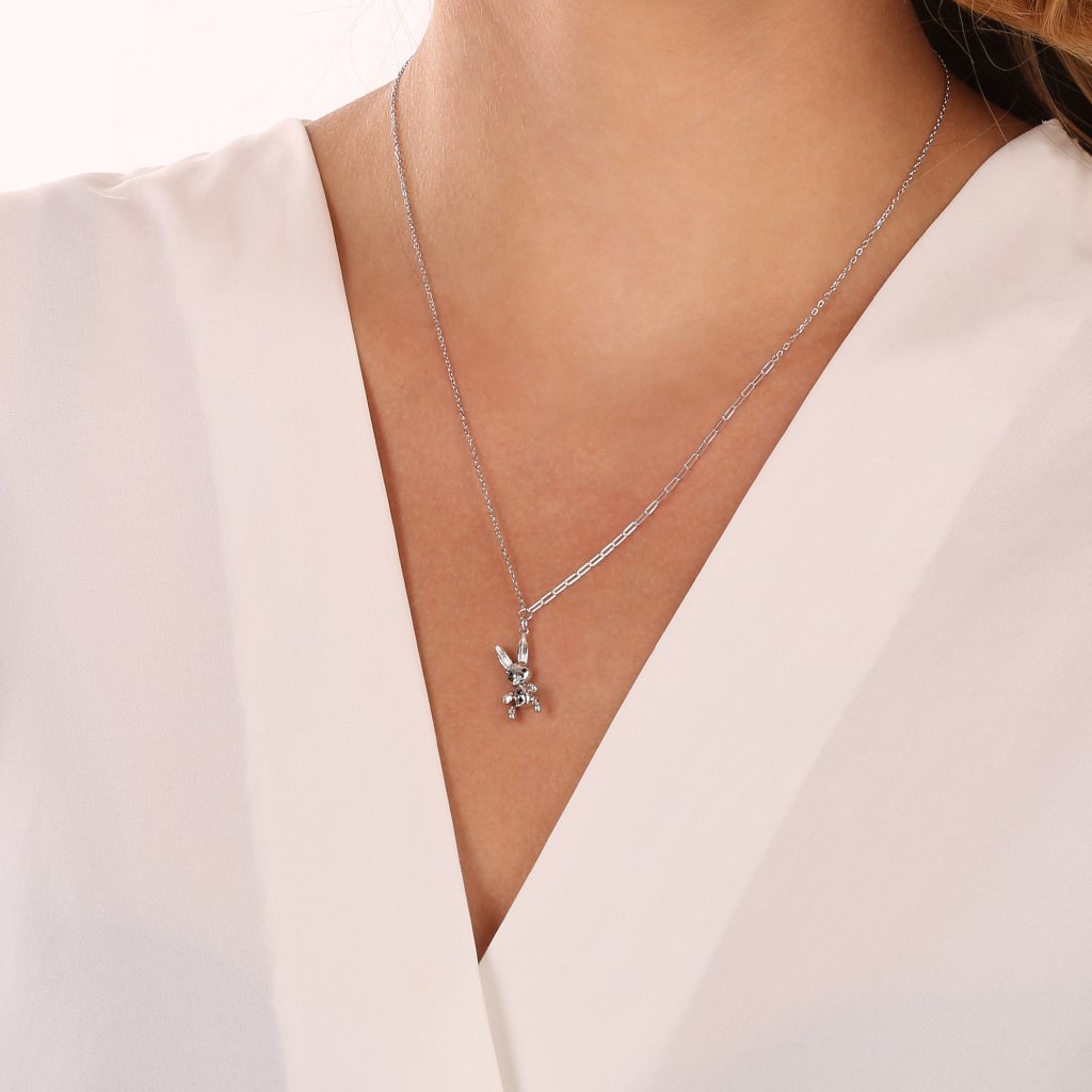 Táto pôvabná kombinovaná retiazka vás získa svojou rozkošnou a originálnou podobou. Náhrdelník s motívom plyšového zajačika je s pohyblivými končatinami. Zajačik sa tak môže aj posadiť. Okrem toho je zdobený nápisom „luck“ ako šťastie a na brušku má roztomilé srdiečka.Náhrdelník je vyrobený zo striebra o rýdzosti 925/1000 a je opatrený vrstvou ródia , ktorá šperk ochráni pred sčernením, zožltnutím alebo poškriabaním.
